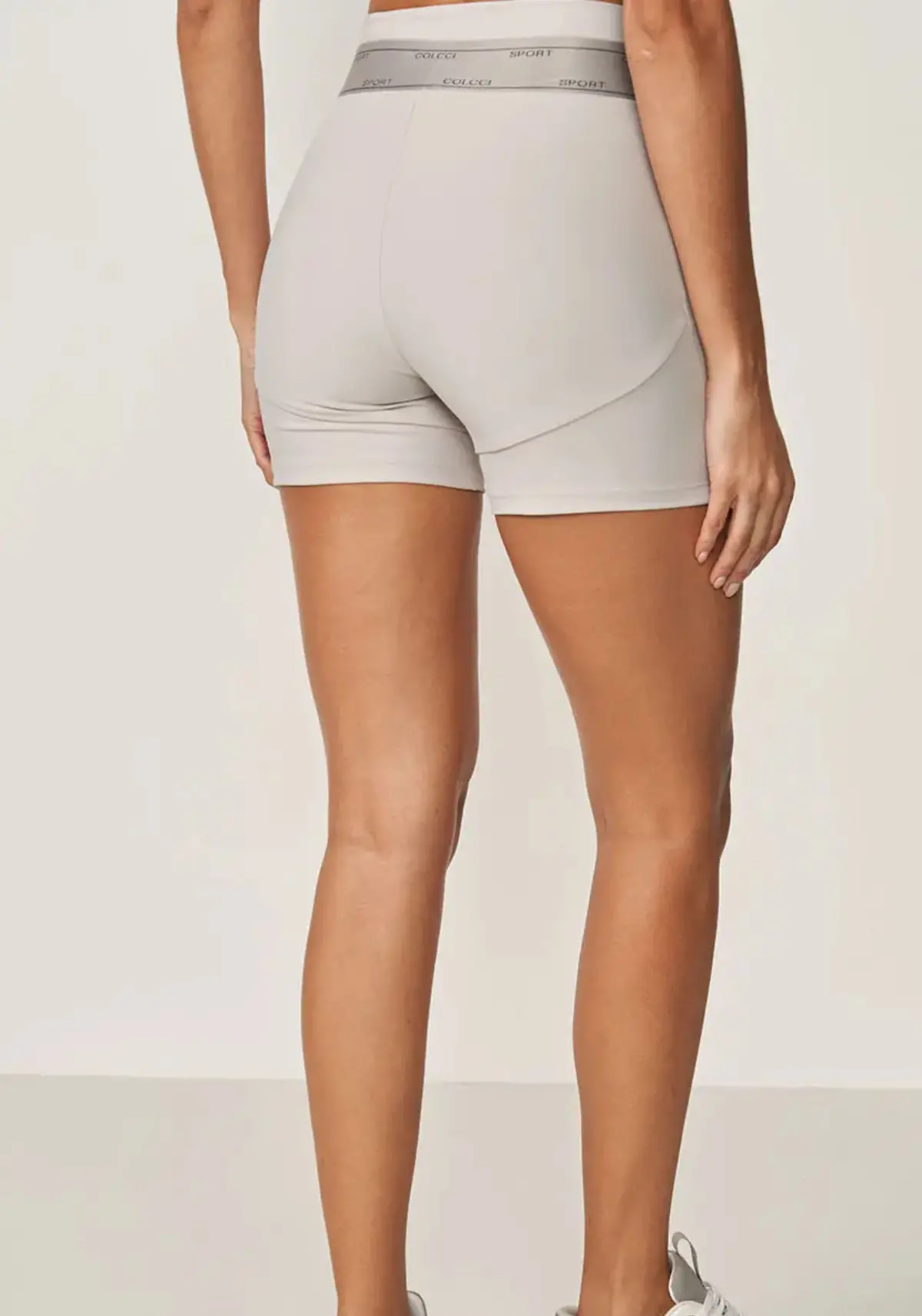 Bermuda: Modelagem slim, cós alto com elástico personalizado, comprimento acima dos joelhos, detalhe em mesh nas laterais.
