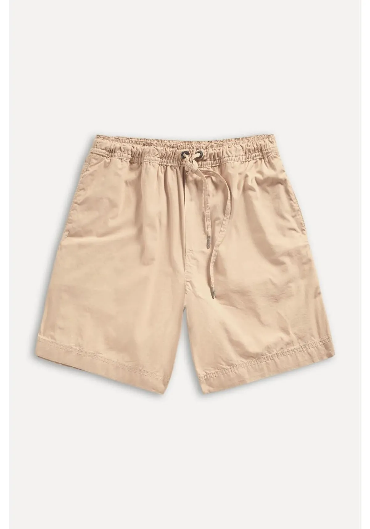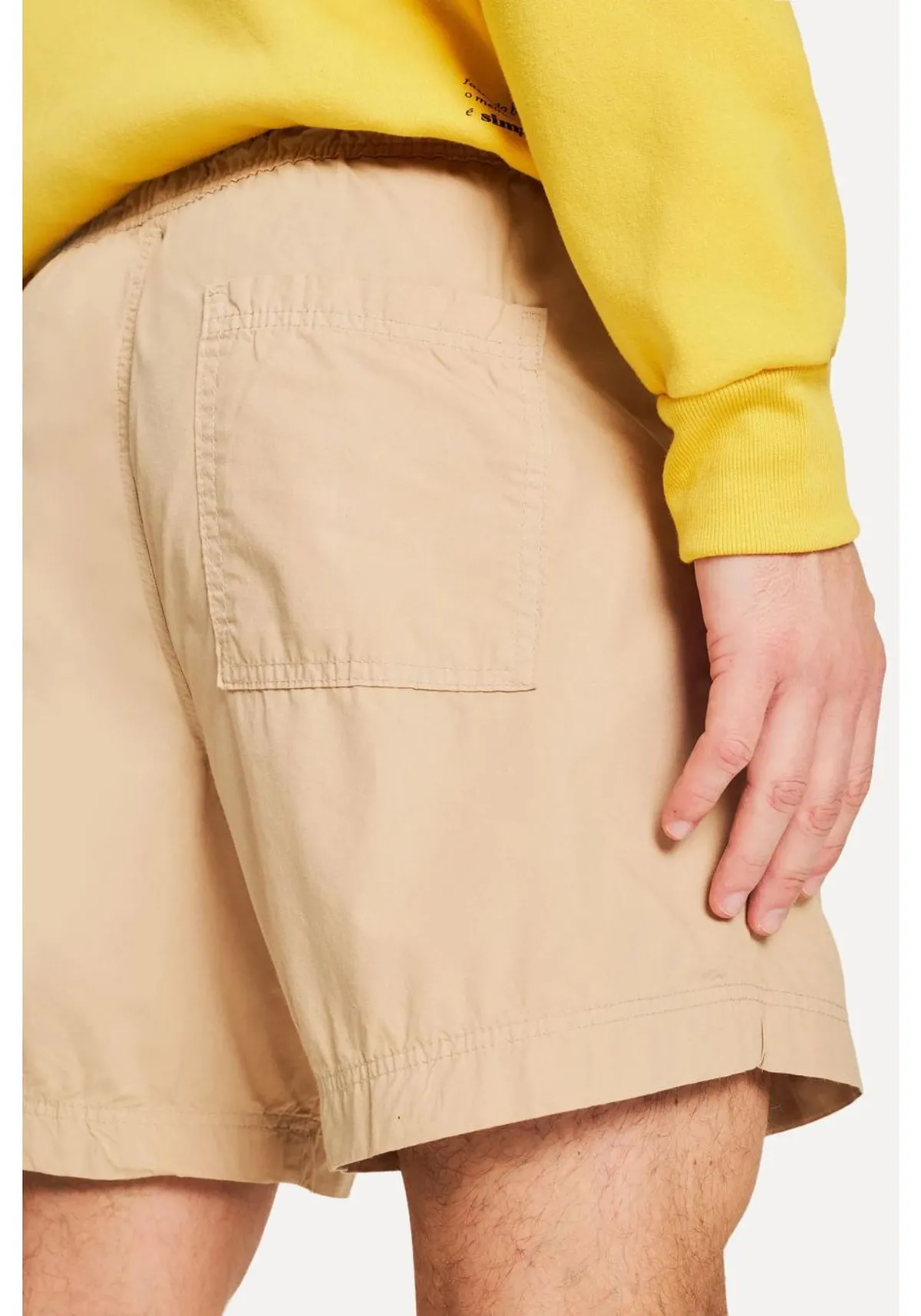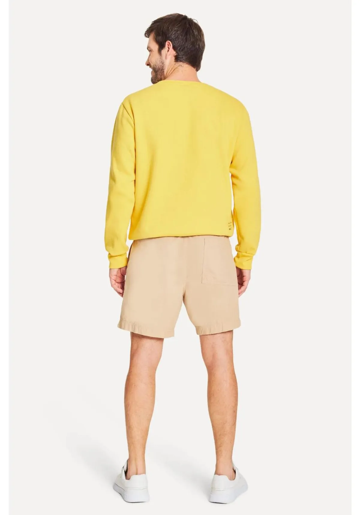 A bermuda apresenta modelagem reta, comprimento acima do joelho, cós médio com elástico e cordão para regulagem, bolsos na frente e atrás.