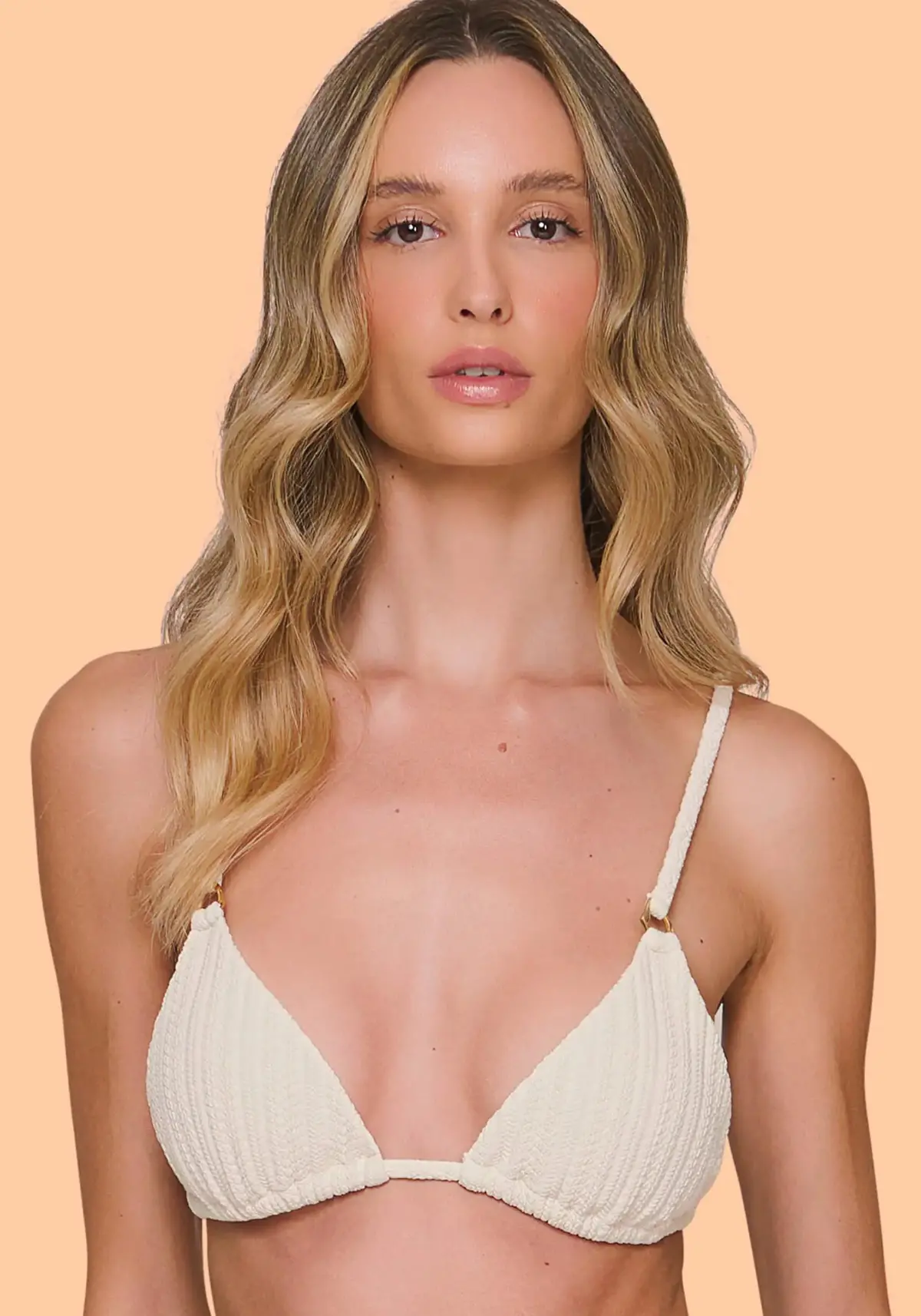 Top cortininha amarração em tecido jacquard beach de poliamida. Possui forro, alças ajustáveis e bojo removível. O icônico biquíni recebe aviamento decorativo de metal em banho ouro de alta qualidade. Versátil, o modelo ganha elegância e sofisticação proporcionando várias composições num estilo easy chic.