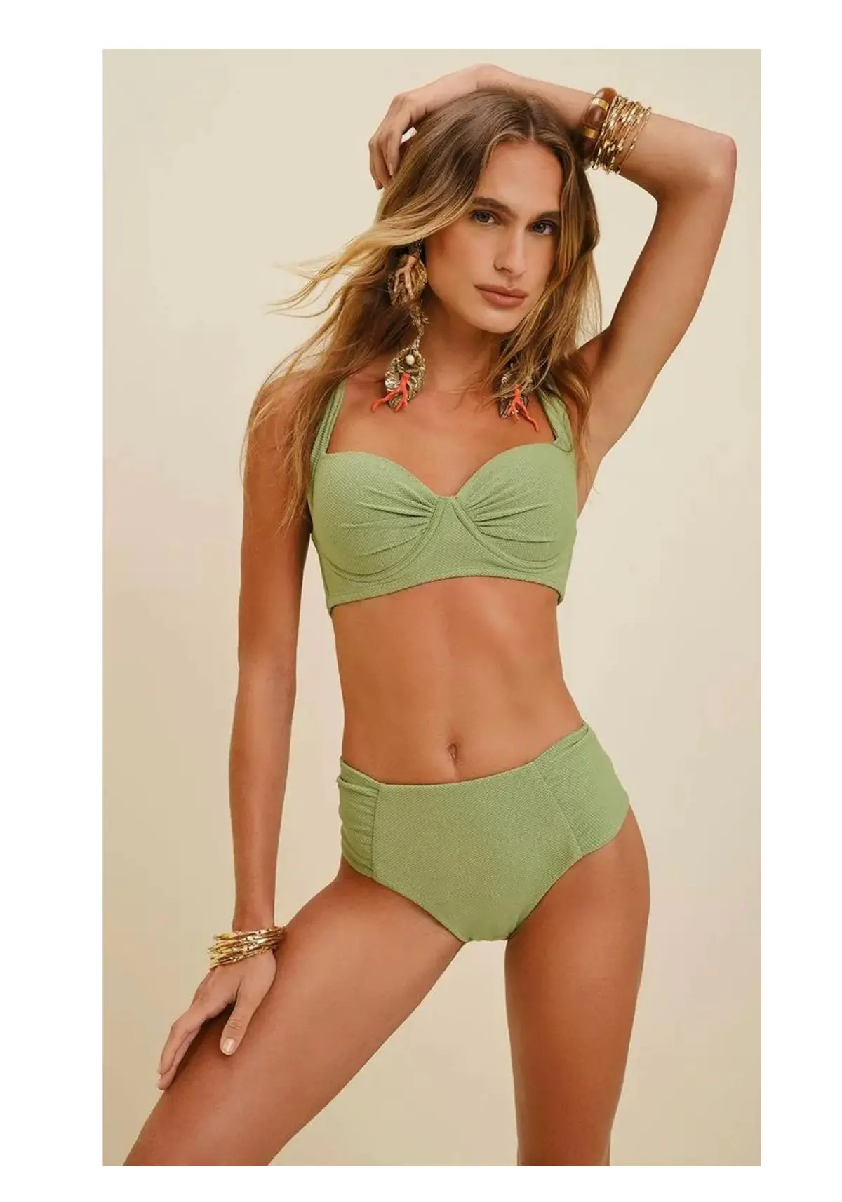 A parte de cima apresenta modelagem meia taça, shape slim, alças largas sem regulagem, faixas para amarração nas costas, bojo removível, detalhe de drapeado na frente. Parte de baixo calcinha com cintura alta, toda forrada, não possui regulagem.