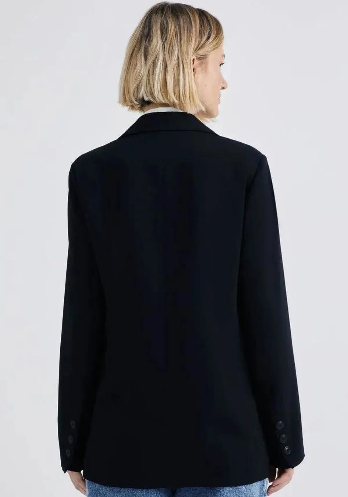 O blazer possui modelagem regular, comprimento alongado, shape reto, gola dupla, decote V, fechamento por botões na frente, bolsos falsos na frente, mangas longas com detalhe de botões no punho, peça toda forrada, possui ombreiras que trazem total elegância a peça, seus detalhes dão um toque de charme e elevam o design do blazer.