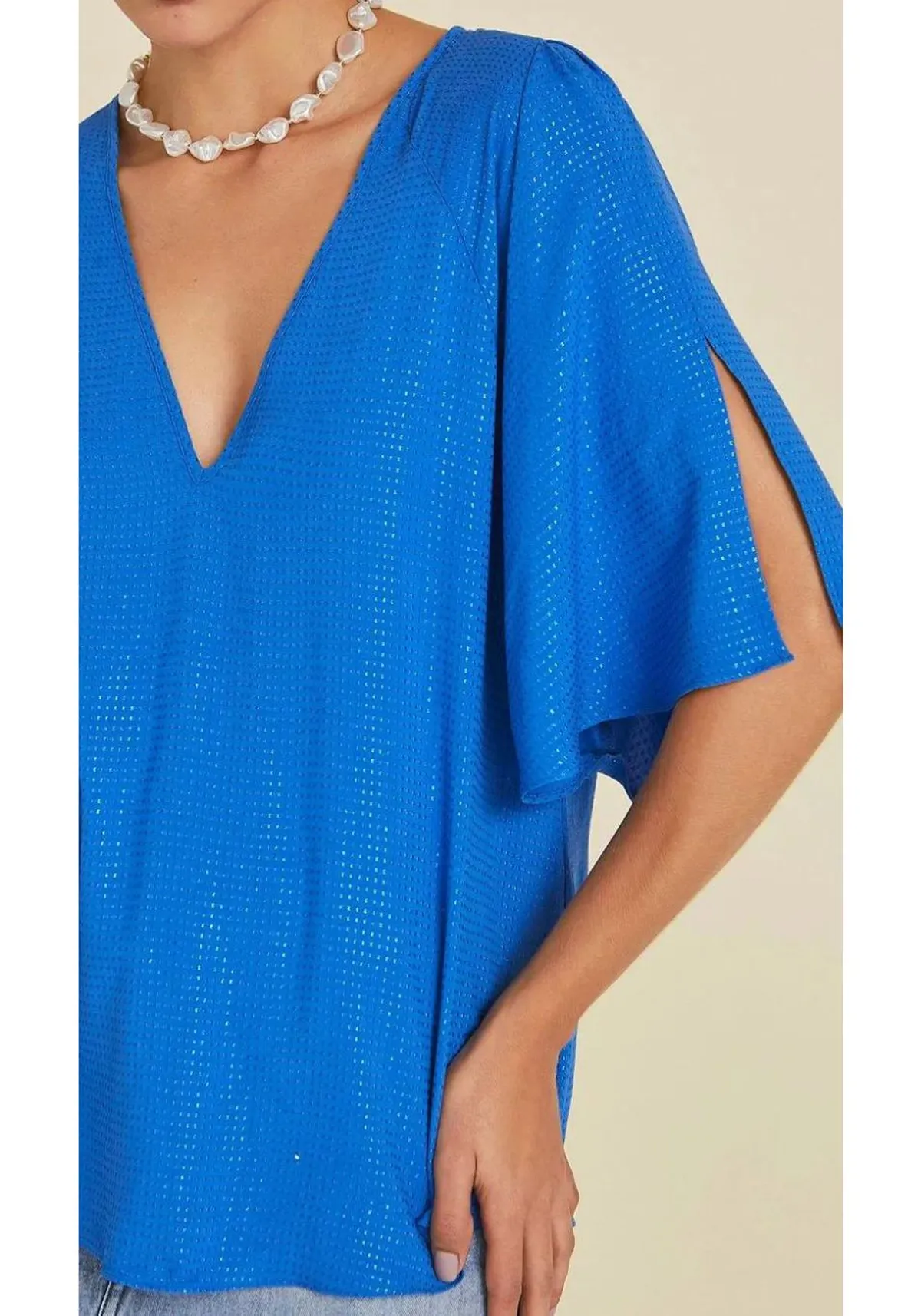 Blusa ampla com decote v e abertura nas mangas, trazendo modernidade e versatilidade em uma só peça.