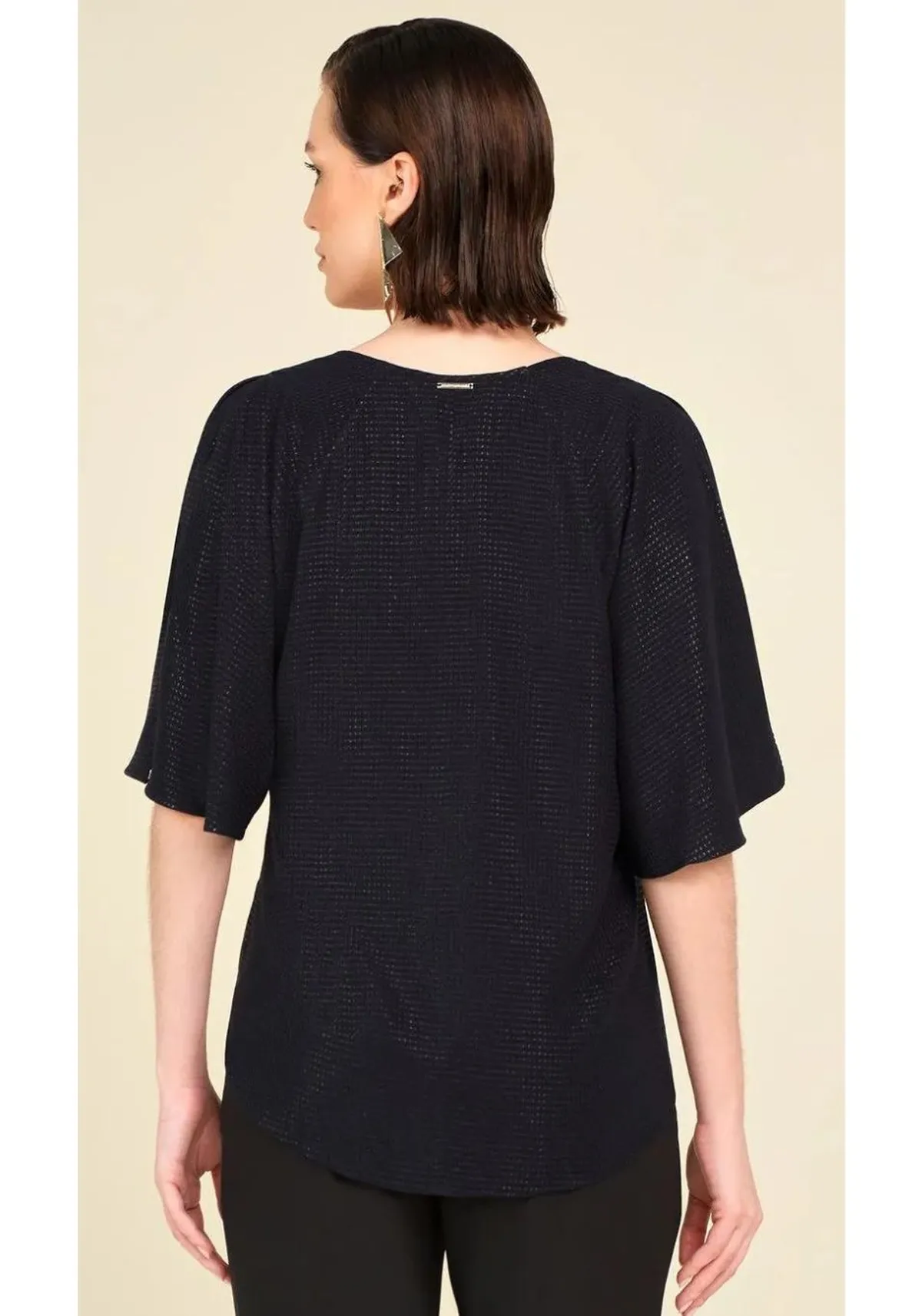 Blusa ampla com decote v e abertura nas mangas, trazendo modernidade e versatilidade em uma só peça.
