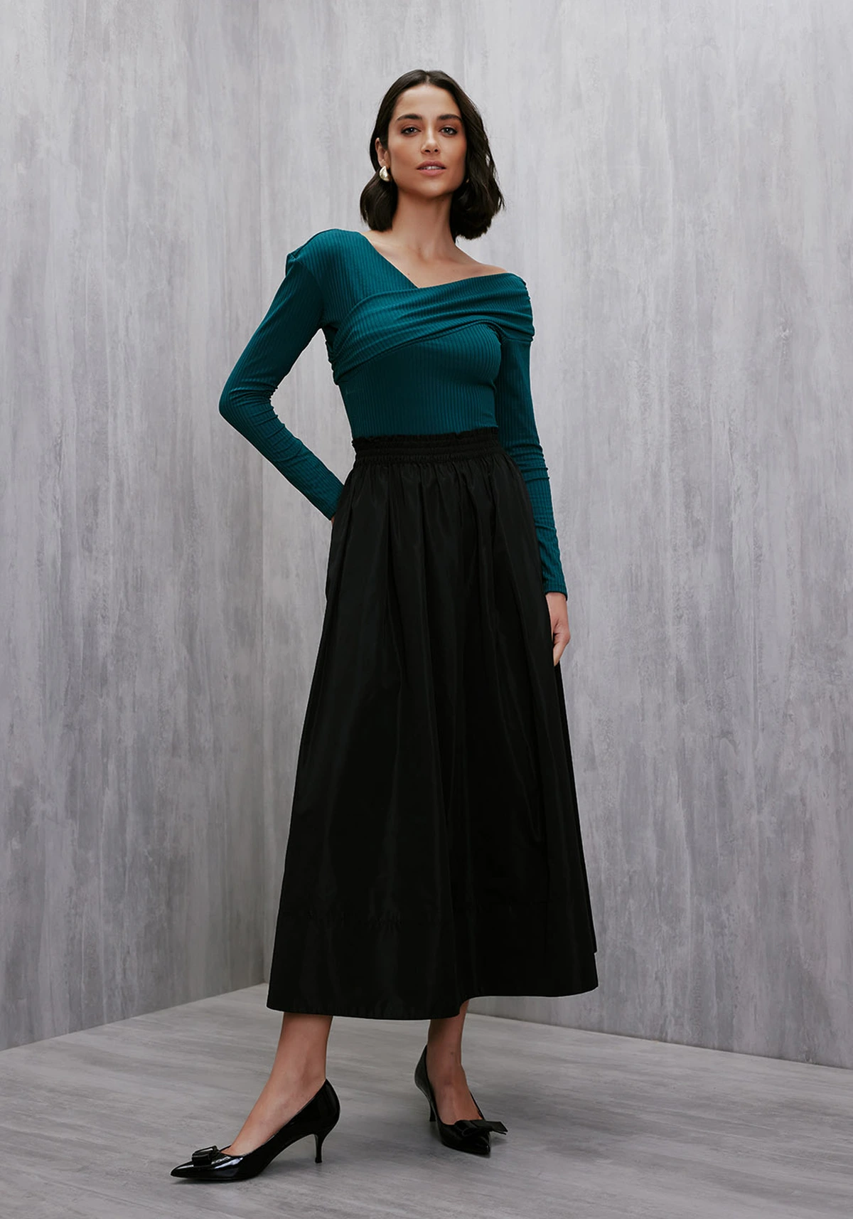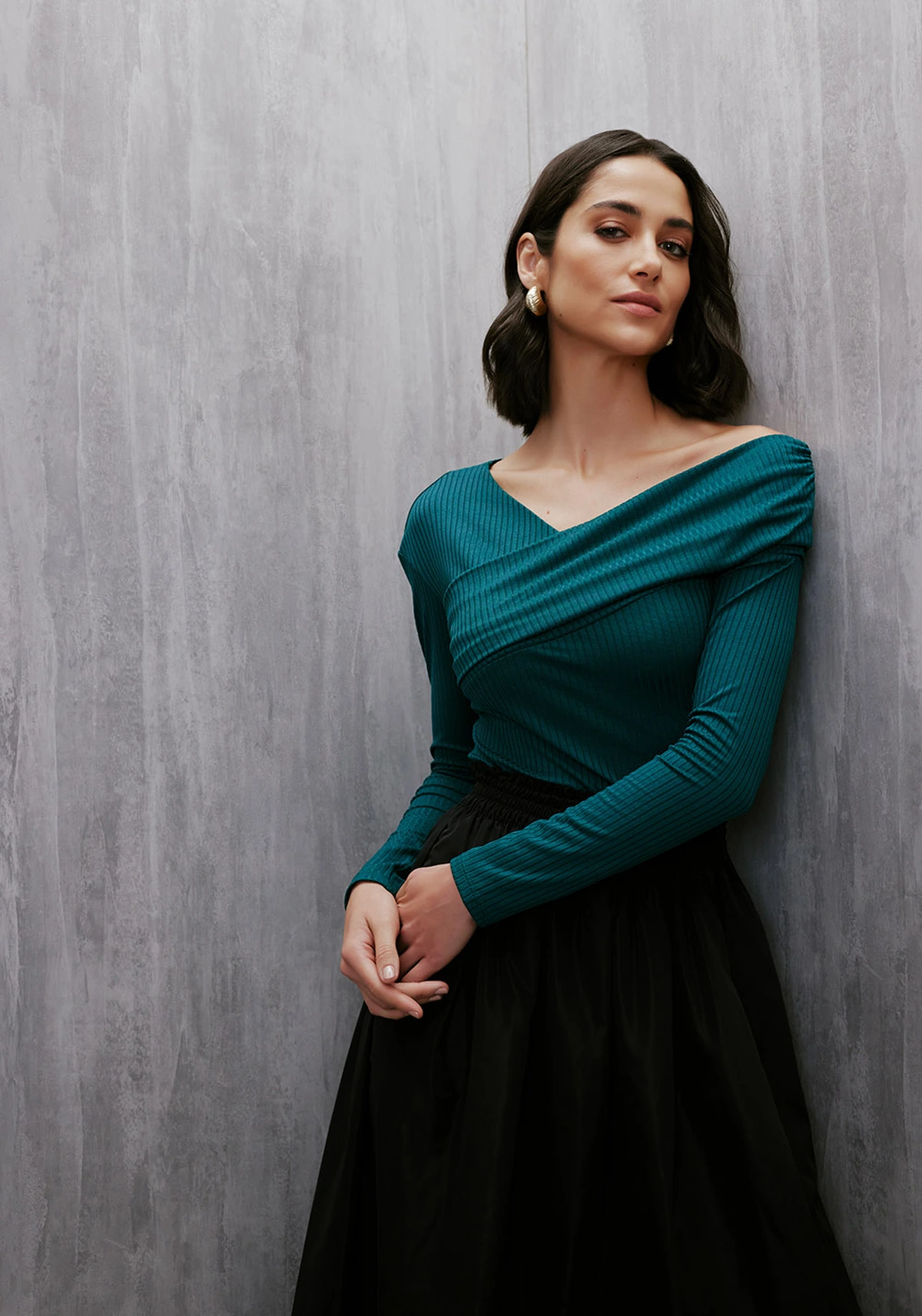 A blusa apresenta mangas longas, com detalhe de mangas ombro a ombro, com uma manga sobreposta, trazendo total charme a peça. Trazendo um decote alongado que valoriza toda a silhueta.