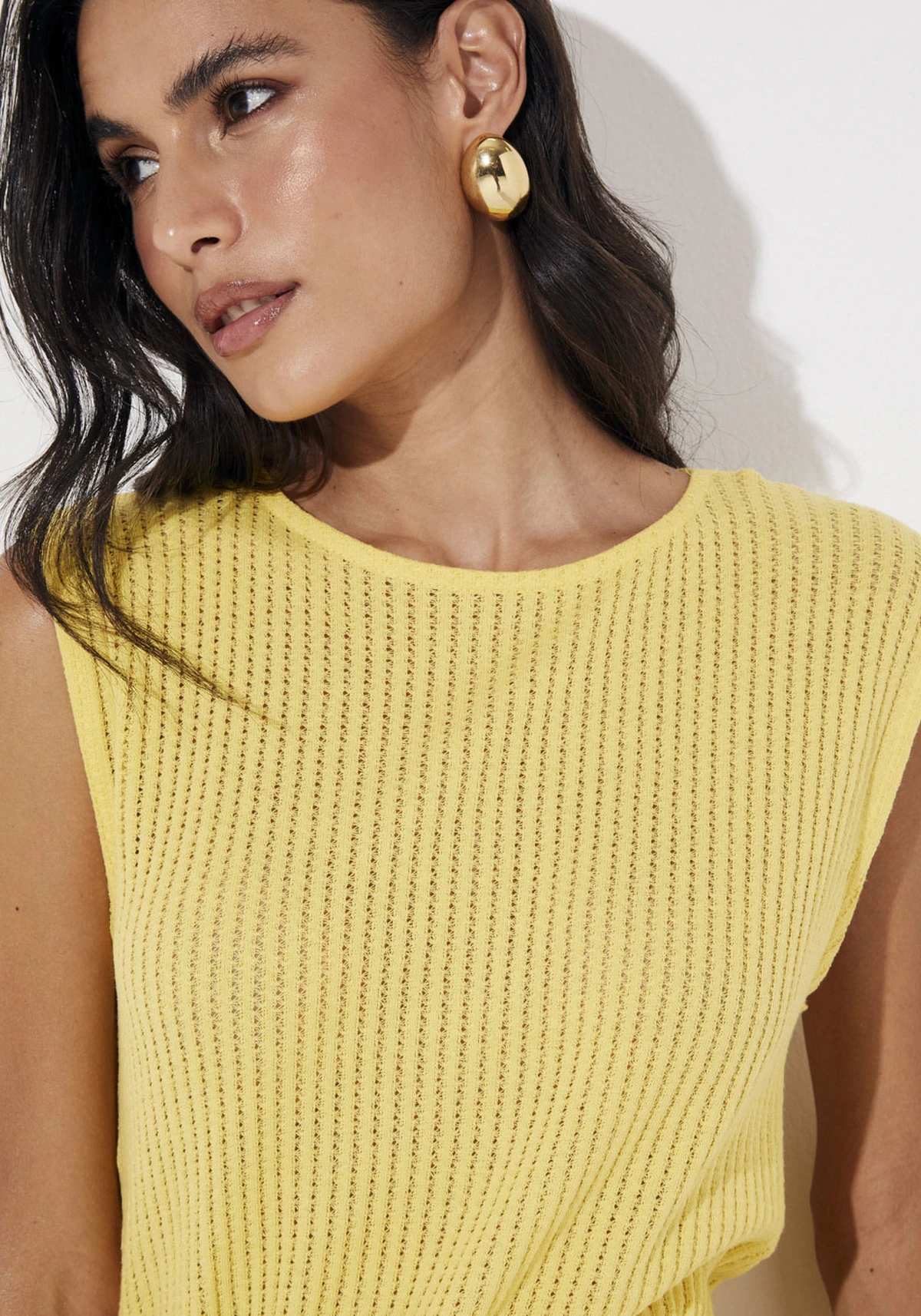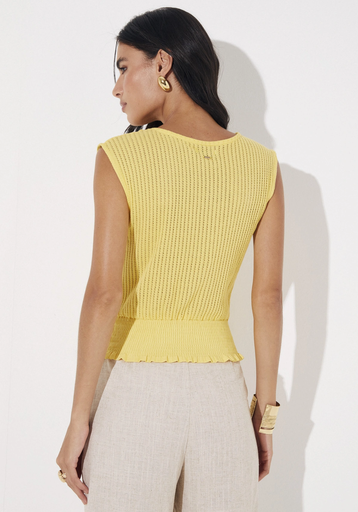 Blusa acinturada com mangas cavadas em tricô, com designer que exala sofisticação.
