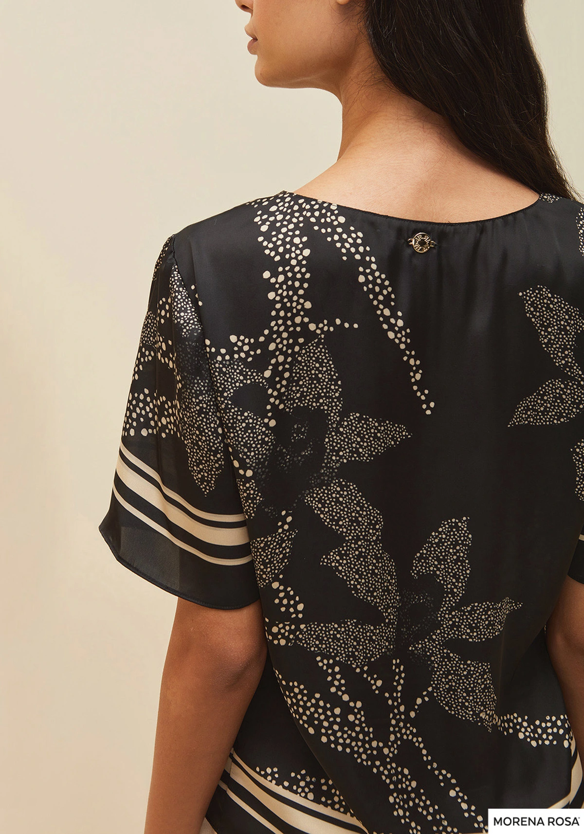 Blusa básica ampla com estampa floral, versátil, atemporal e moderna.