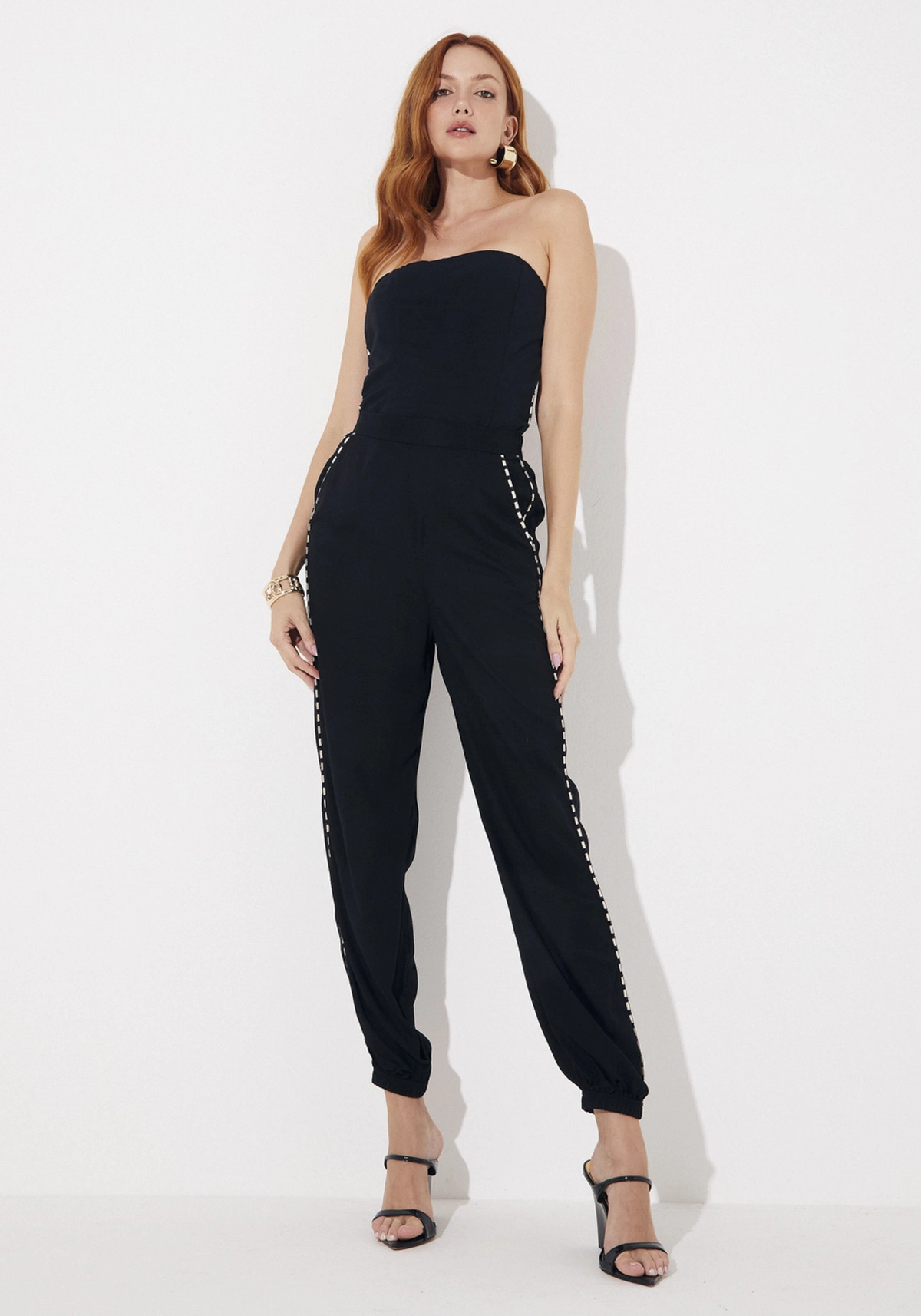 A blusa apresenta modelagem reta, shape slim, decote tomara que caia, fechamento por zíper atrás, elástico interno na barra para melhor ajuste, detalhe de faixa bordada nas laterais nas cores preto e branco, não possui bojo, costuras que valorizam.