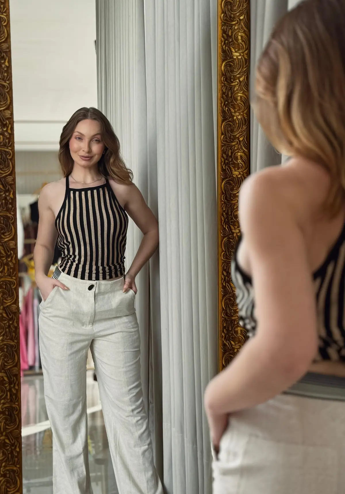 A blusa apresenta modelagem comfy, shape solta, decote quadrado, alças finas fixas, detalhe de cava francesa, sem mangas, não possui bojo, listras verticais em dourado e preto.