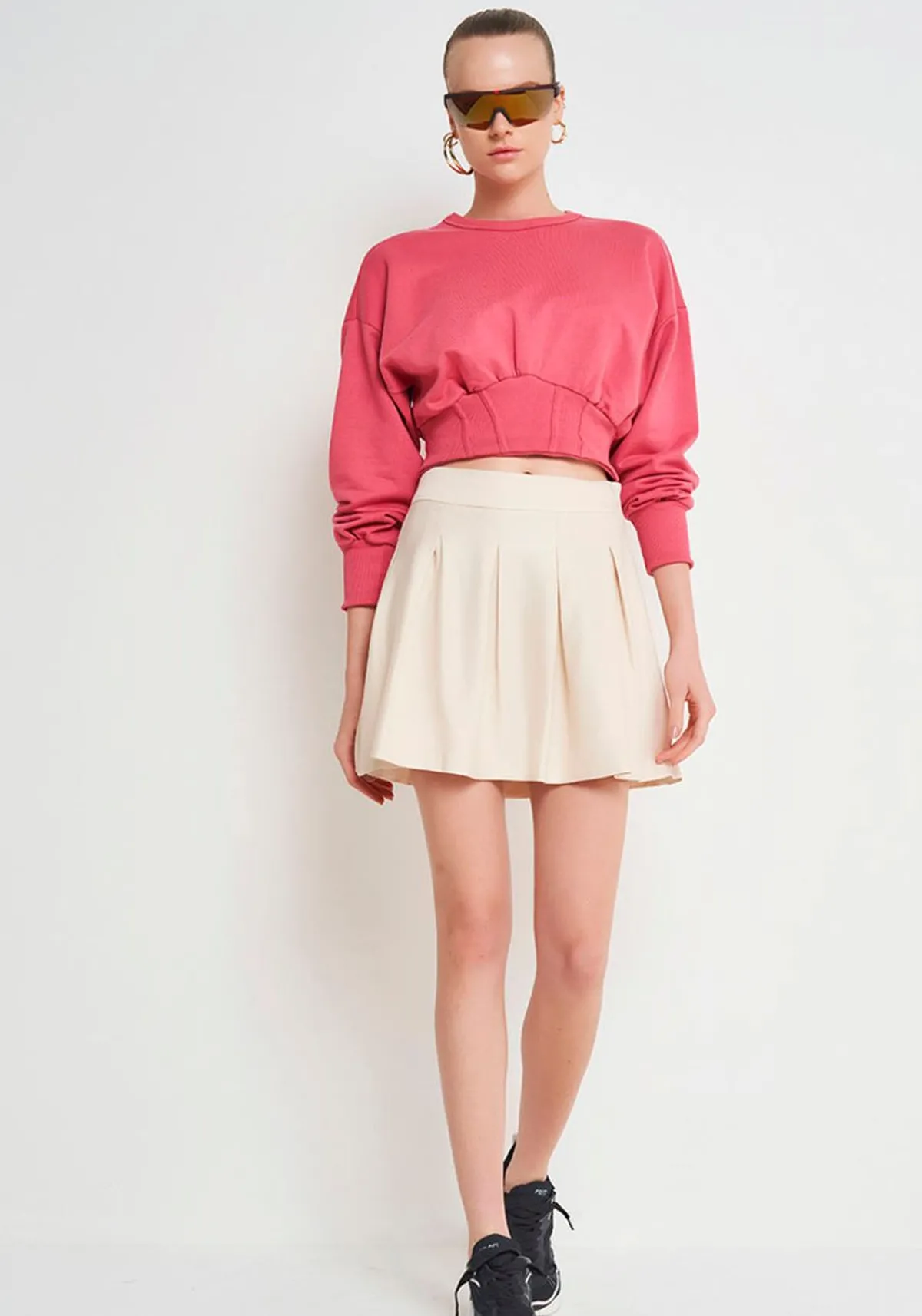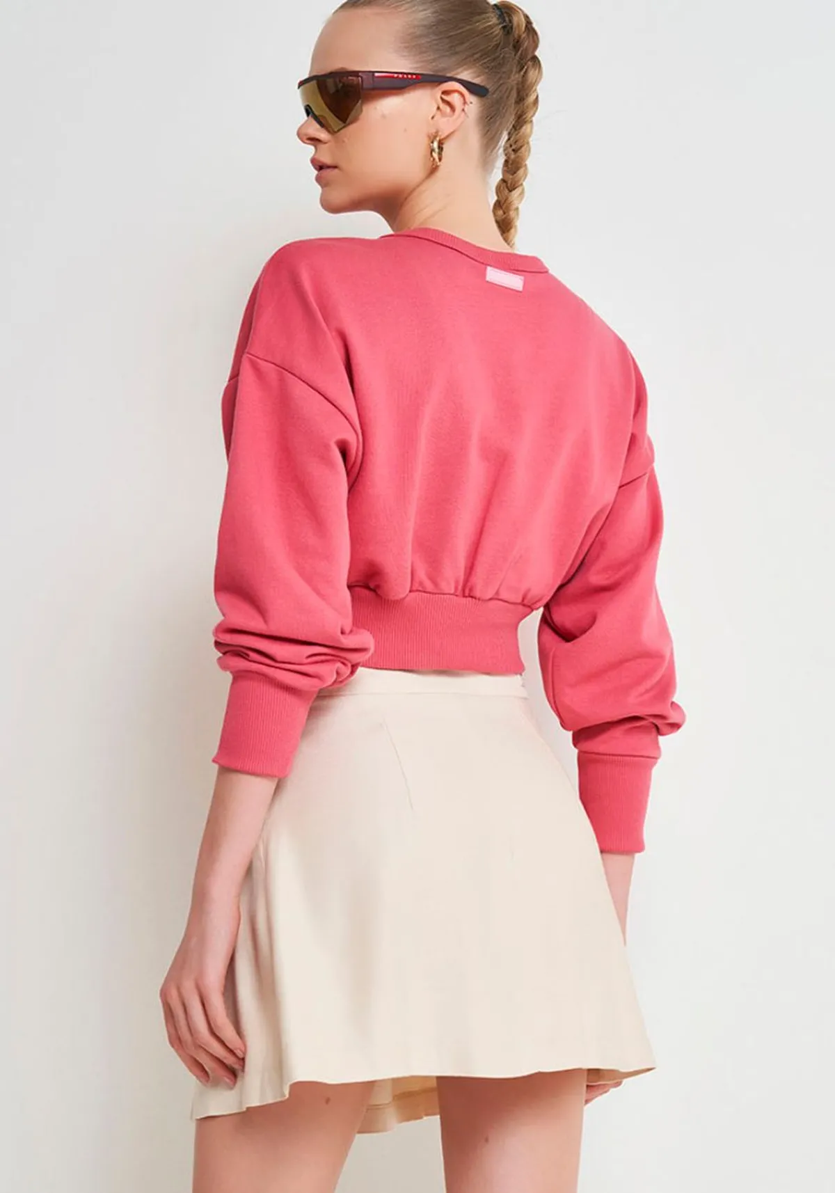Possui comprimento cropped, modelagem comfy, mangas longas.