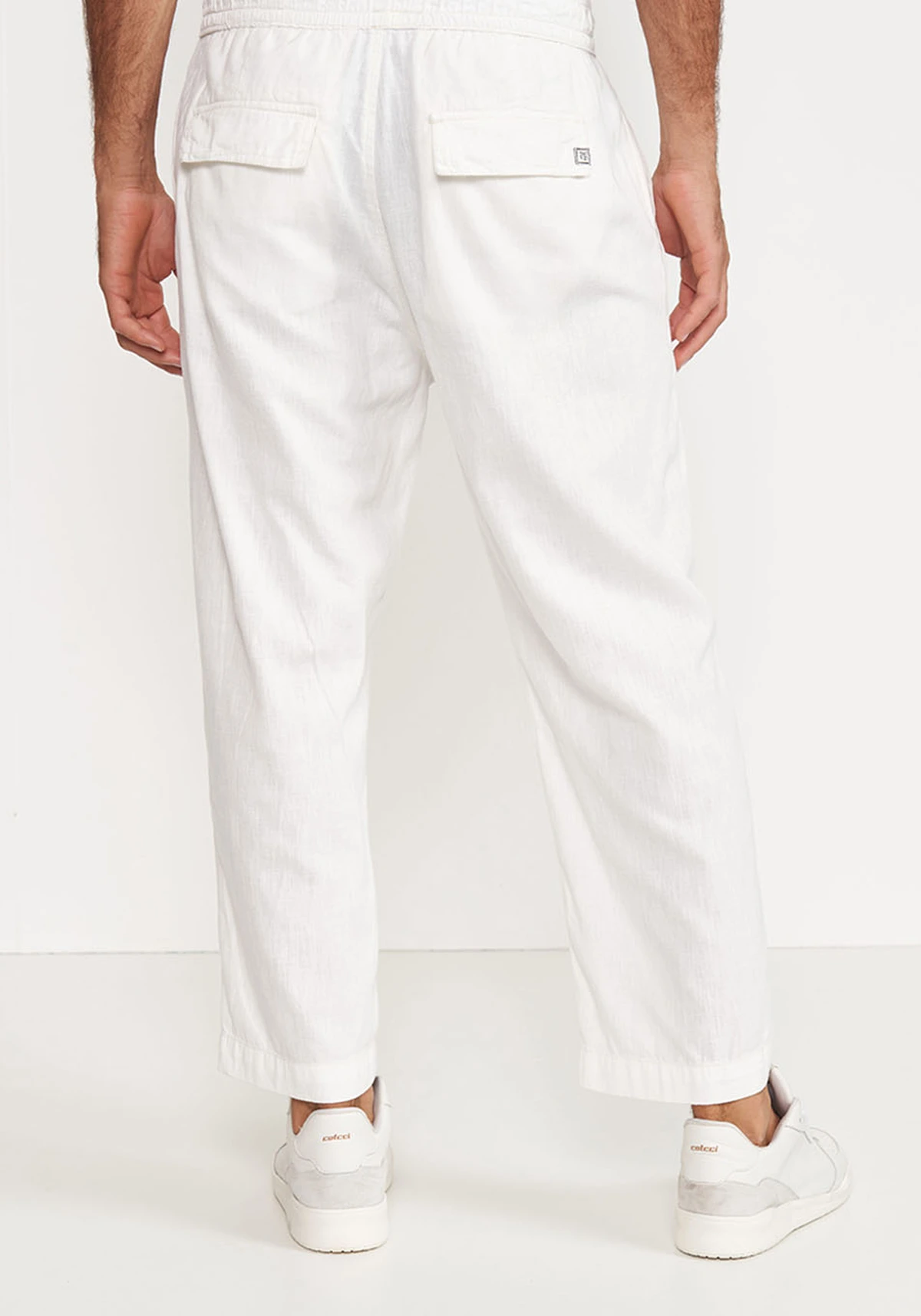 A calça apresenta modelagem reta, tipo jogger mas sem elástico na barra, cós com elástico, bolsos faca na frente, bolsos com lapela atrás, barra com acabamento simples.