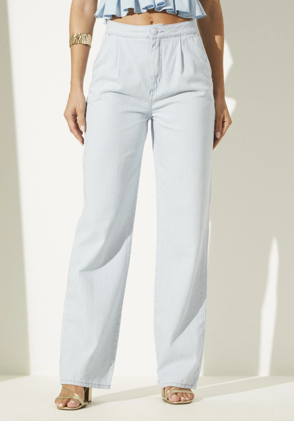 A calça apresenta modelagem reta straight, shape justo na cintura e solto nas pernas, cintura alta, fechamento por zíper e botão forrado na frente, bolsos faca na frente, pregas na frente e atrás valorizam a cintura, barra com acabamento simples, com estampa de listras verticais.