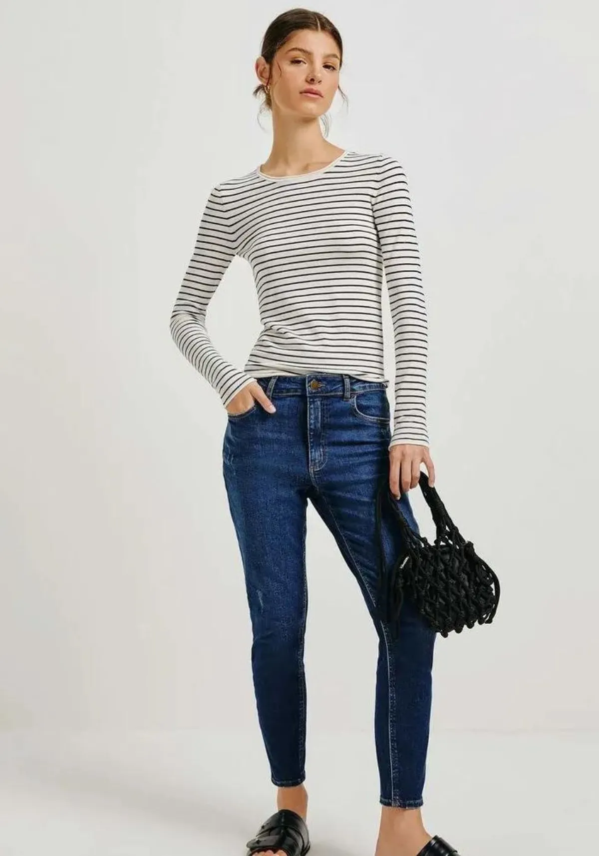 Possui modelagem skinny com comprimento levemente encurtado e detalhes de puídos.