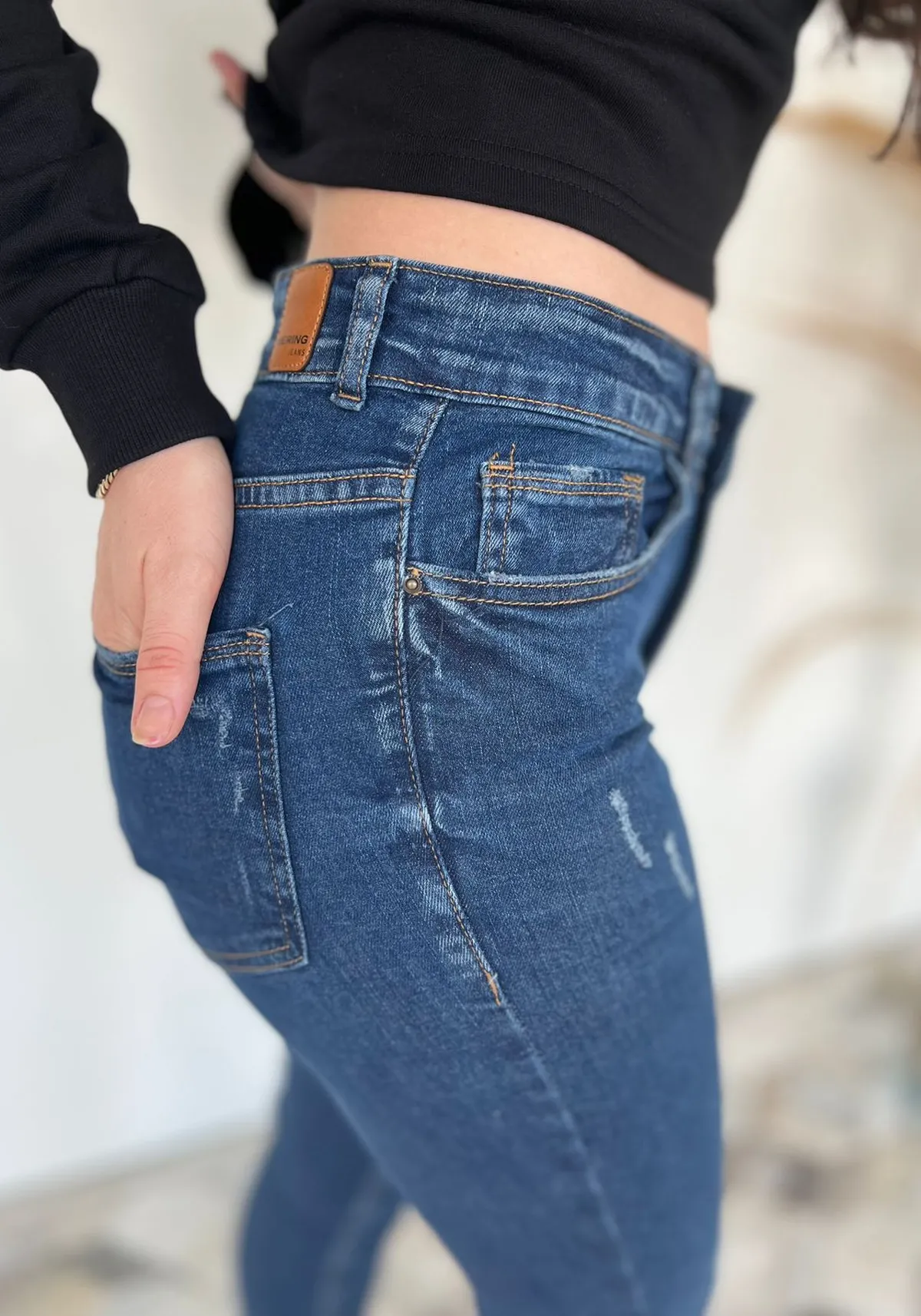 Elaborada em jeans de algodão com elastano super flexível e com toque macio.
