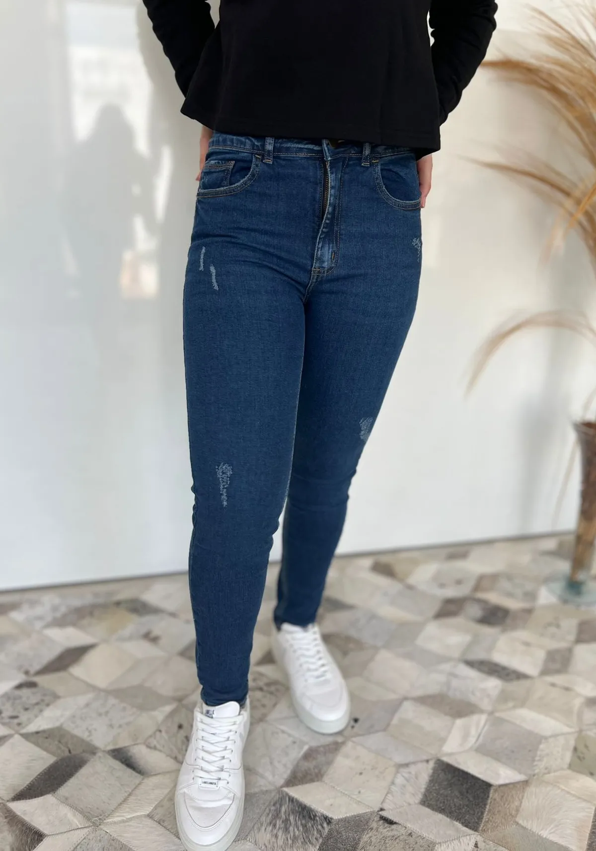 Calça jeans básica feminina cintura média skinny com puídos, feita para ser a sua nova queridinha do armário.