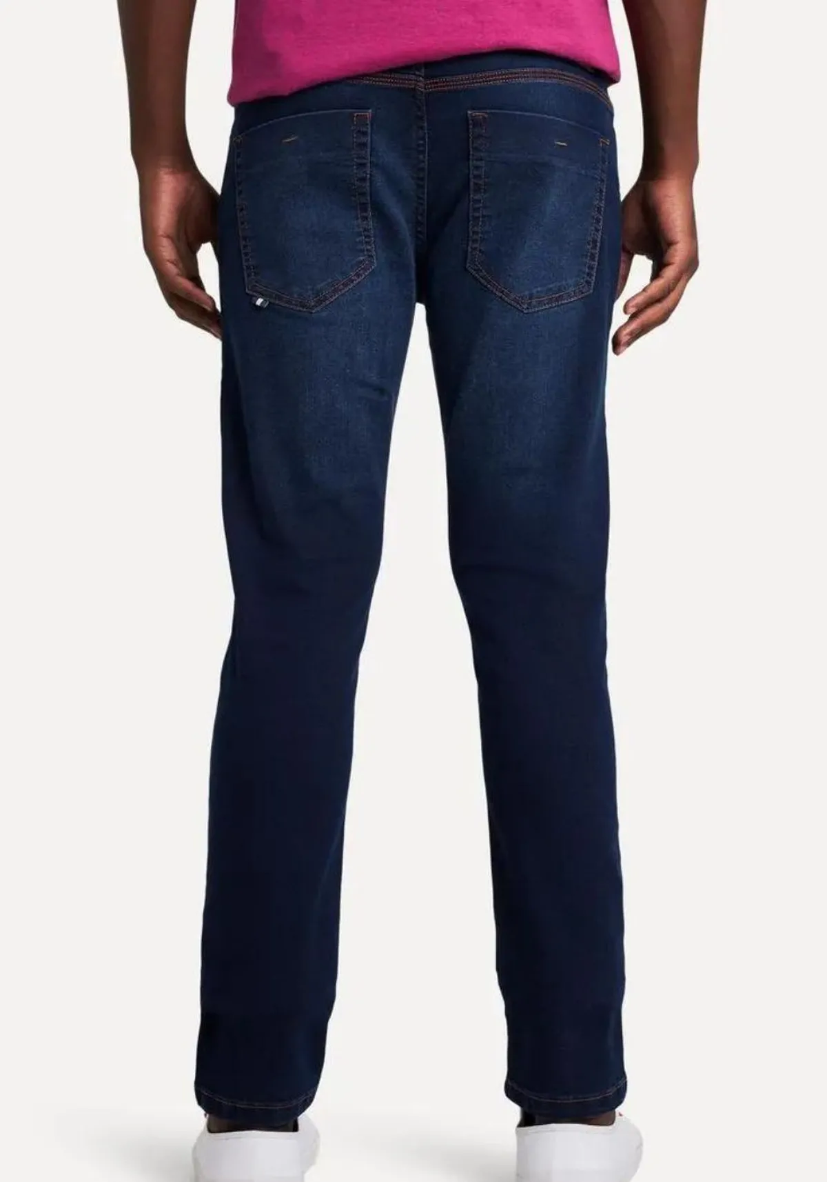Calça jeans, modelagem skinny, possui bolsos na frente e atrás, fechamento por zíper e botão na frente.