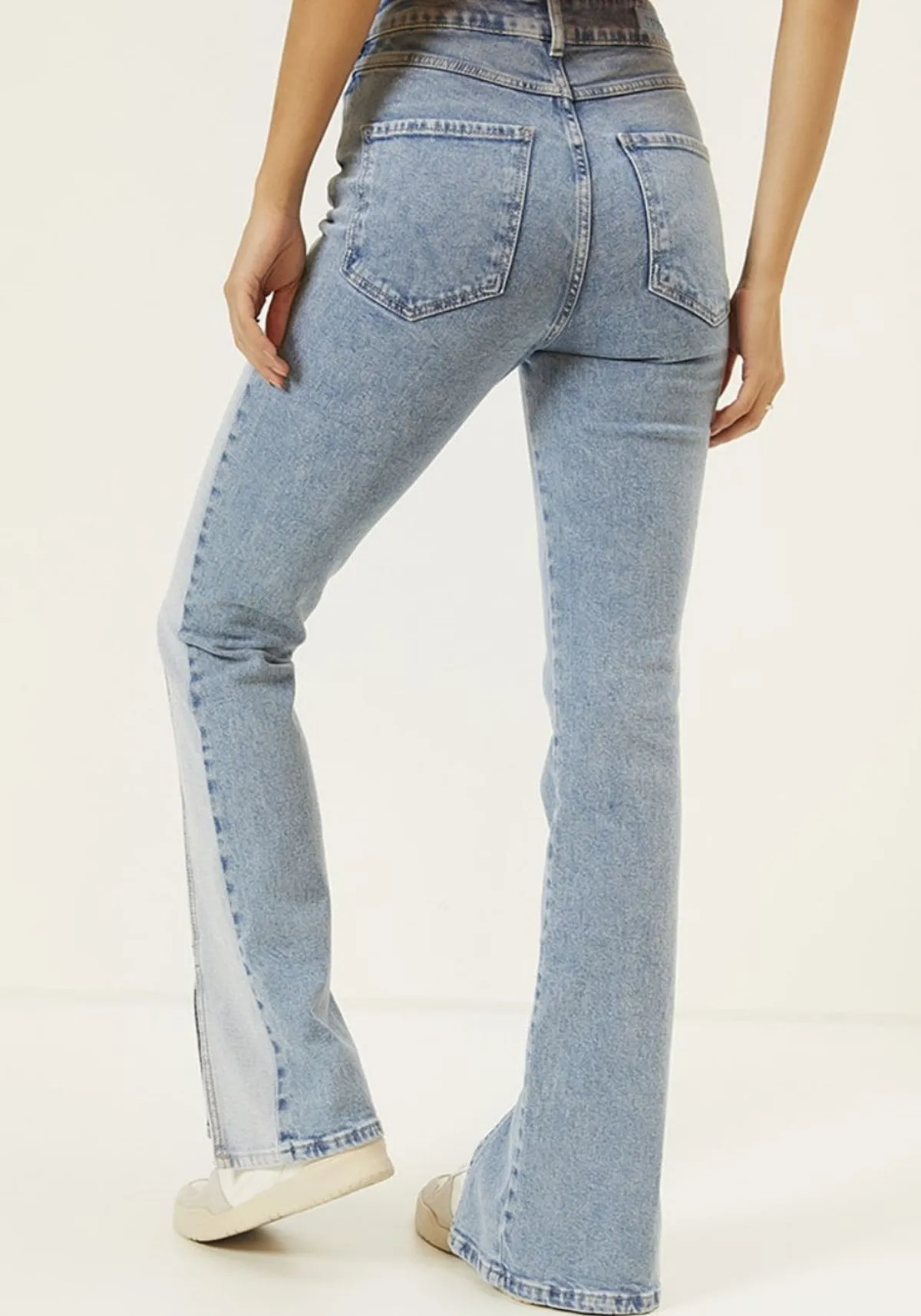 A peça possui cós com passantes, fecho com botão em metal, abertura frontal com zíper embutido, bolsos five pocket, detalhe do jeans em dois tons e aplicação de barra com logo na parte traseira.