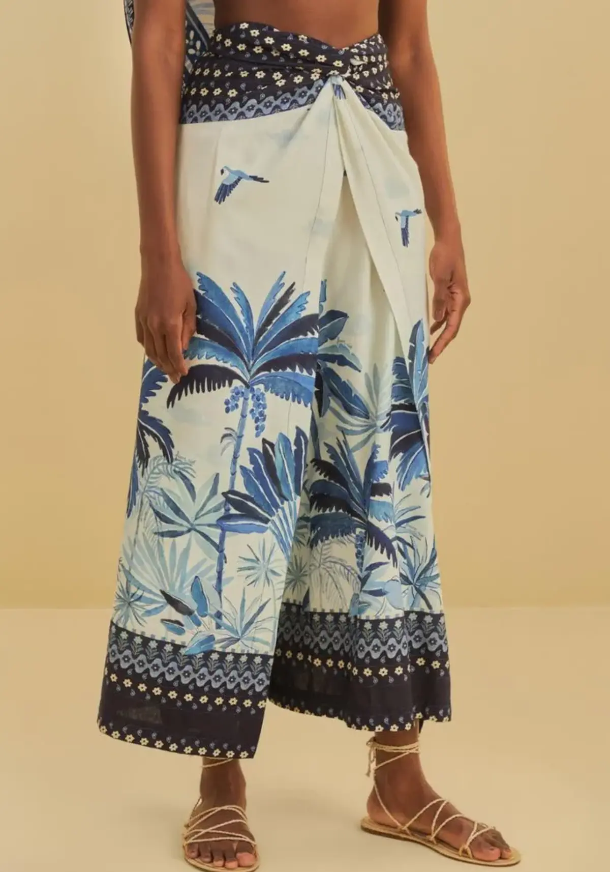 Um degradê que começa com tons de azul e rosa suave na parte superior da calça e desce para laranja e roxo nas pernas.