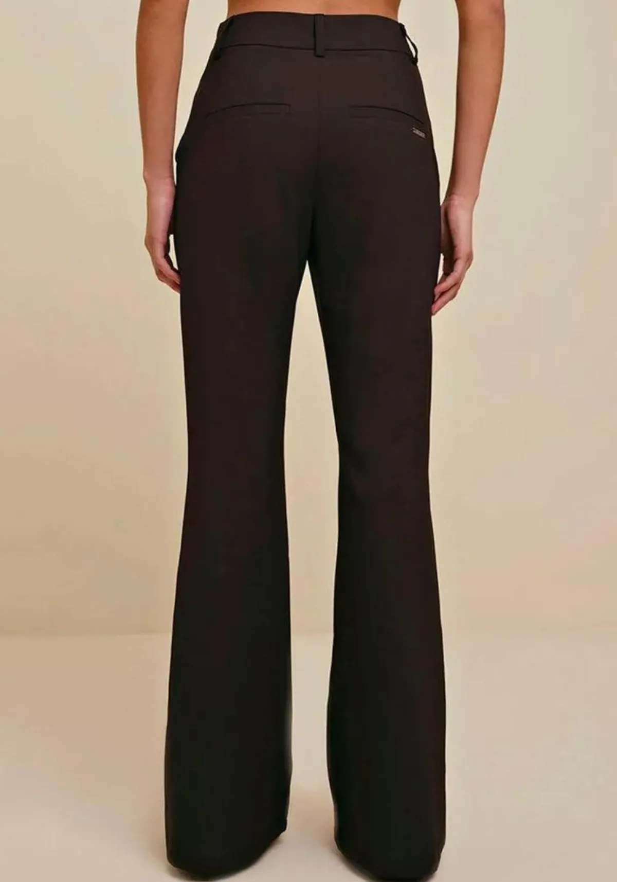 A calça apresenta modelagem boot cut, shape justo na cintura, cós alto com passantes, fechamento por zíper na frente e botões internos, bolsos nas laterais, bolsos falsos atrás, toda forrada garantindo transparência zero, detalhes básicos e modernos que valorizam o corpo.
