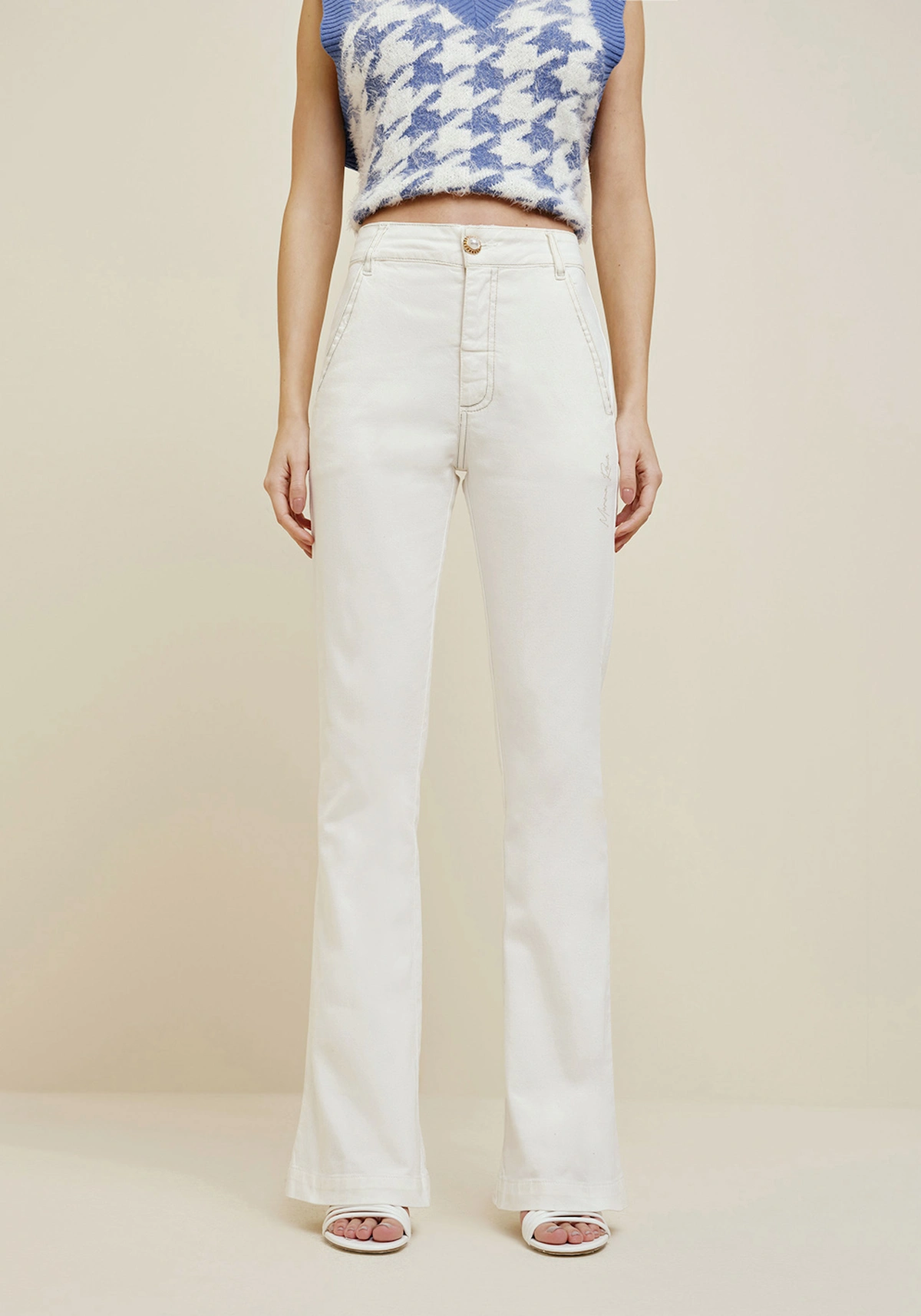 A calça apresenta modelagem flare, shape justo ao corpo, cintura alta, cós com passantes, fechamento por zíper e botão personalizado na frente, bolso faca frontal, bolsos funcionais atrás, detalhe de bordado da logo na lateral da perna, detalhes básicos e modernos que valorizam o corpo.