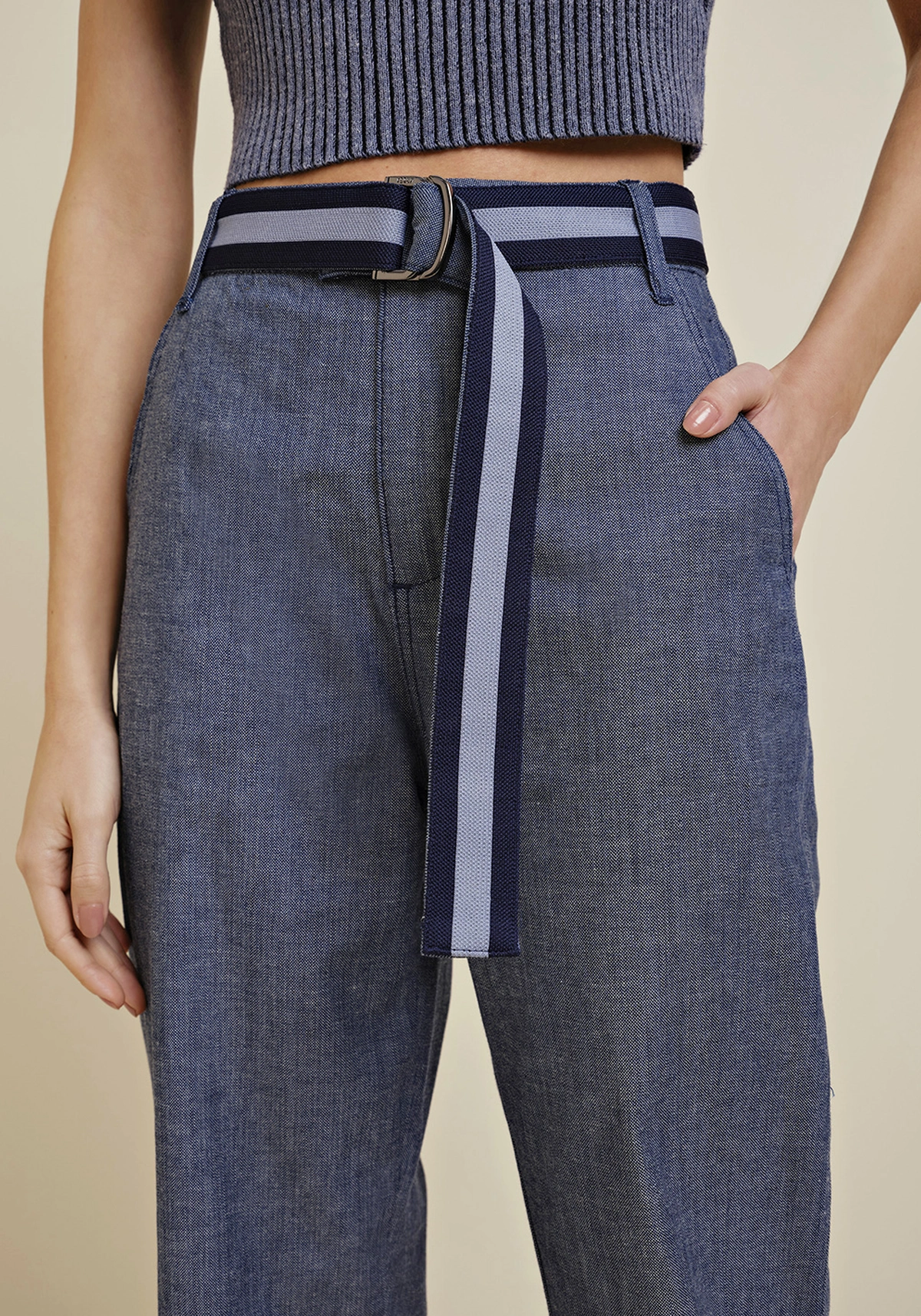 A calça apresenta modelagem reta, shape slim, cós alto com passantes, fechamento por zíper na frente e fechos metálicos internos, bolsos nas laterais e atrás, possui cinto removível com detalhe em galão, para ajuste na cintura.