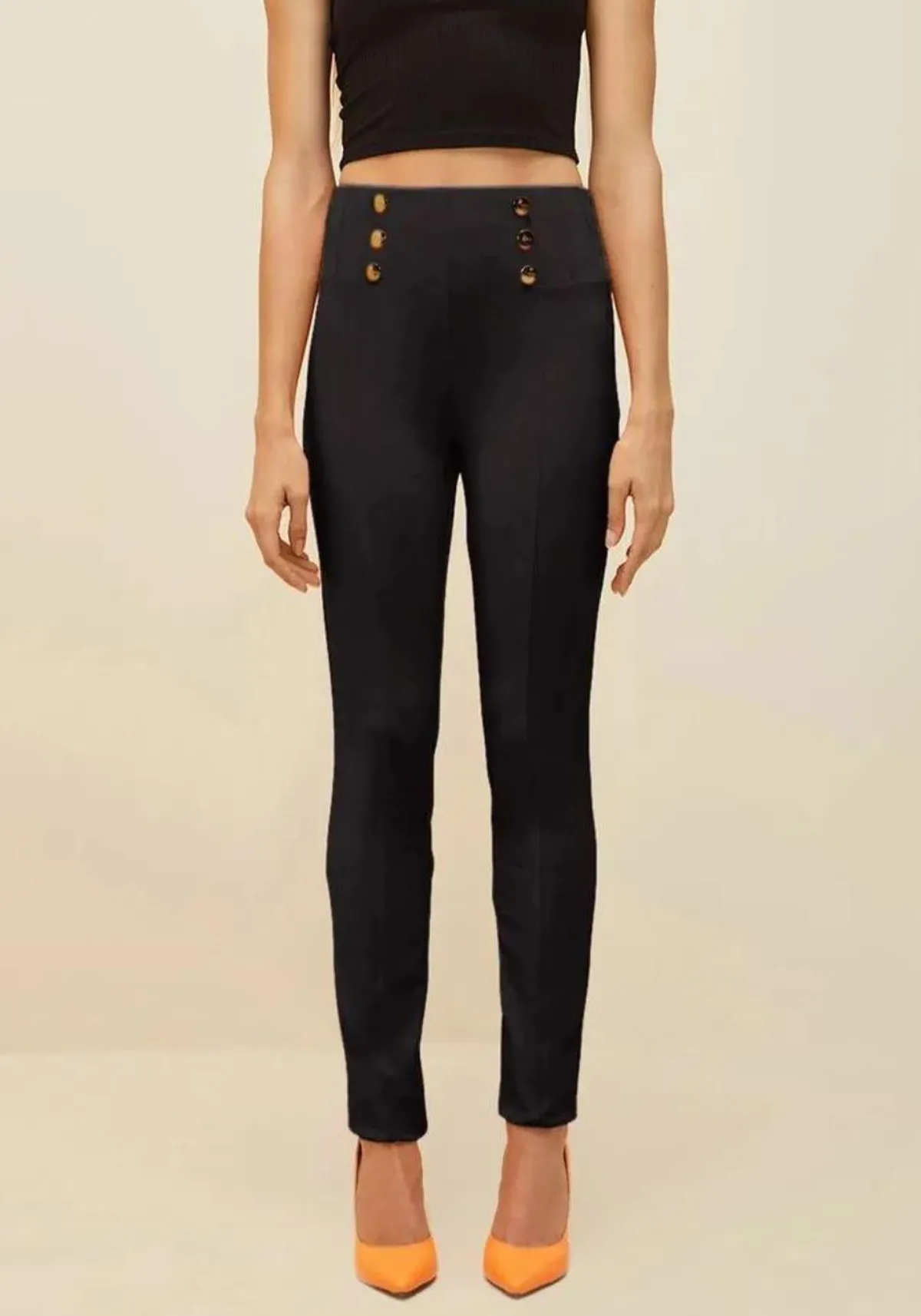 Calça skinny, toda forrada, cós alto, com detalhe de botões falsos.