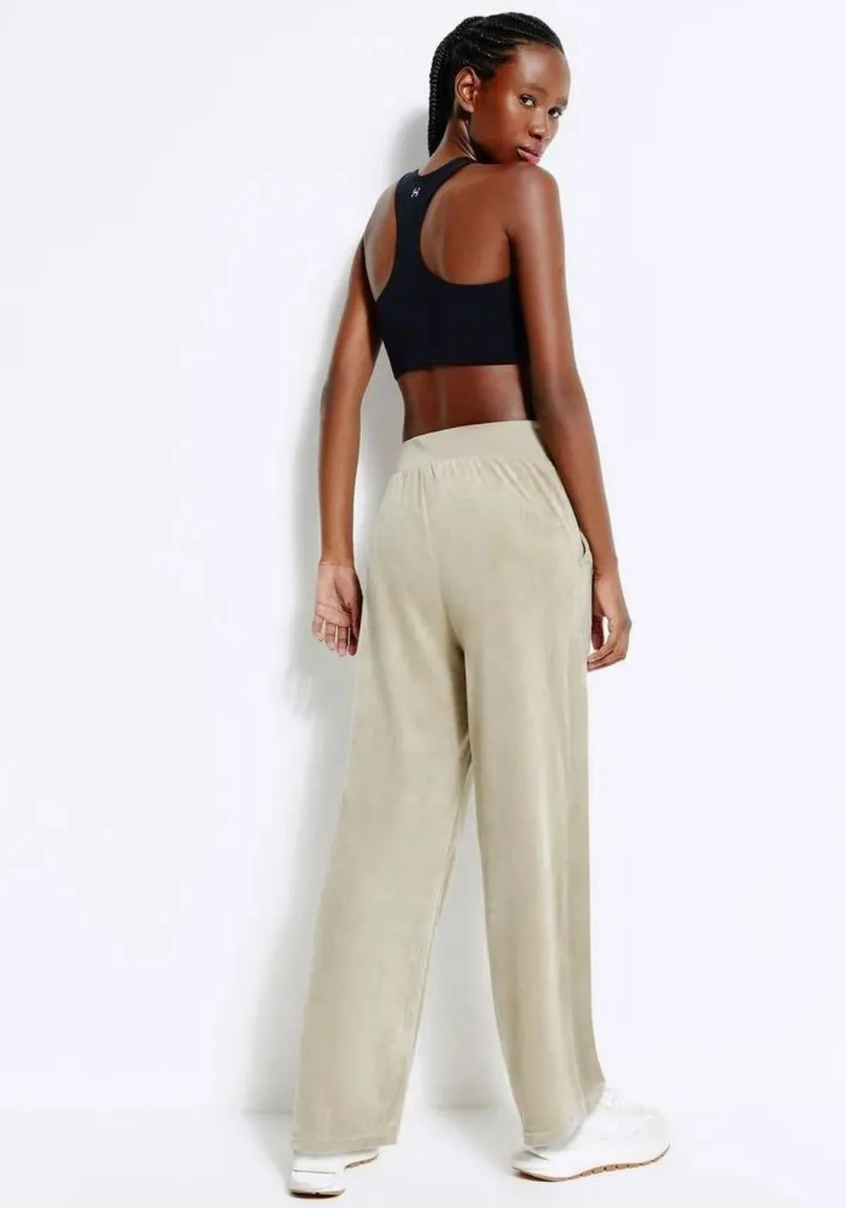 Calça pantalona elaborada em tecido plush que garante toque macio, oferece conforto e estilo para atividades esportivas ou momentos casuais.