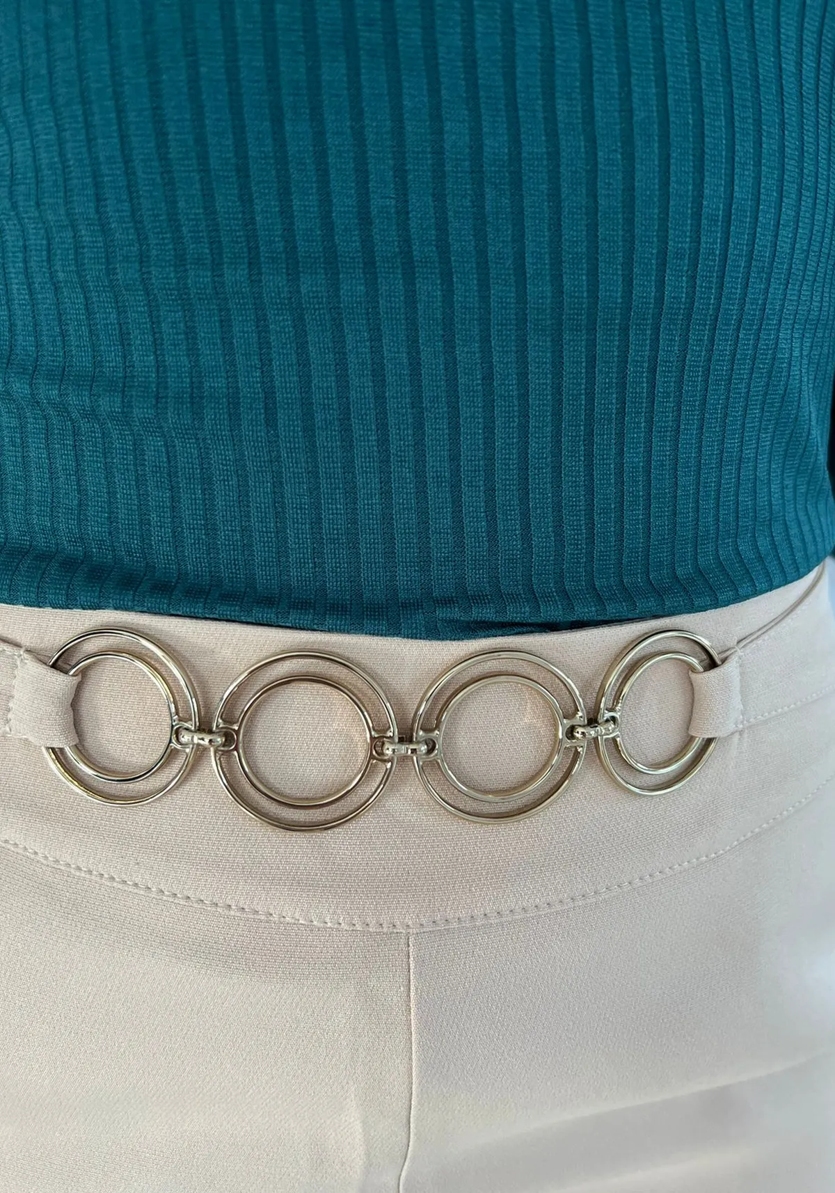 O detalhe do cinto com argolas douradas no cós, adiciona um toque de sofisticação ao visual, podendo ser um ponto focal do look, já o corte reto, proporciona um caimento elegante e confortável.