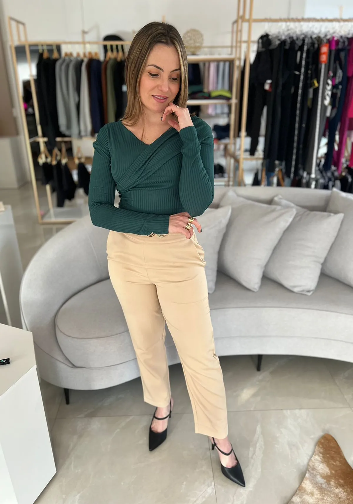 Calça reta em alfaiataria com detalhe no cós, modela e valoriza o corpo, com modernidade e charme.