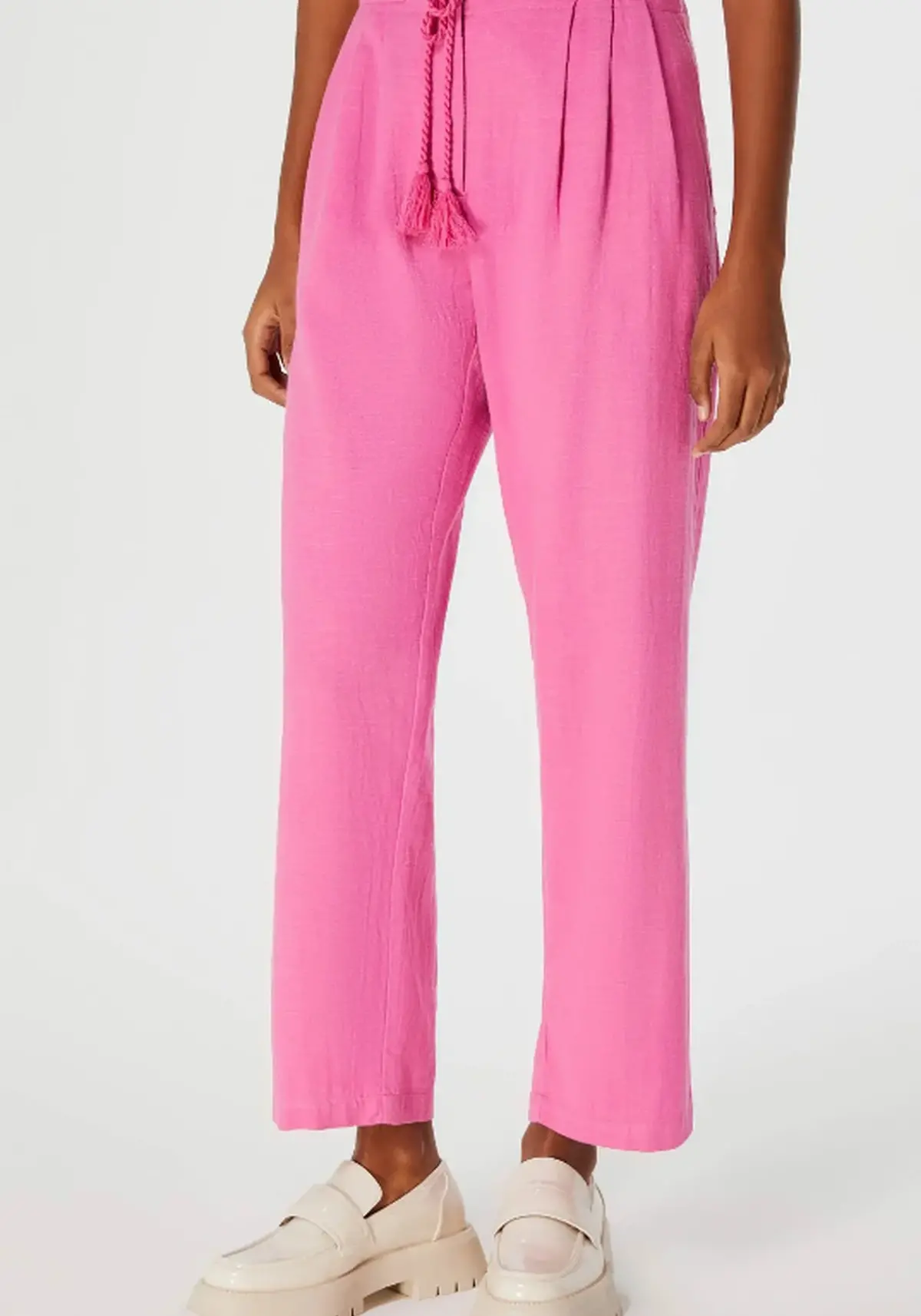 Feita em tecido de algodão, possui cós clochard adornado com passantes largos e cordão com tassel.