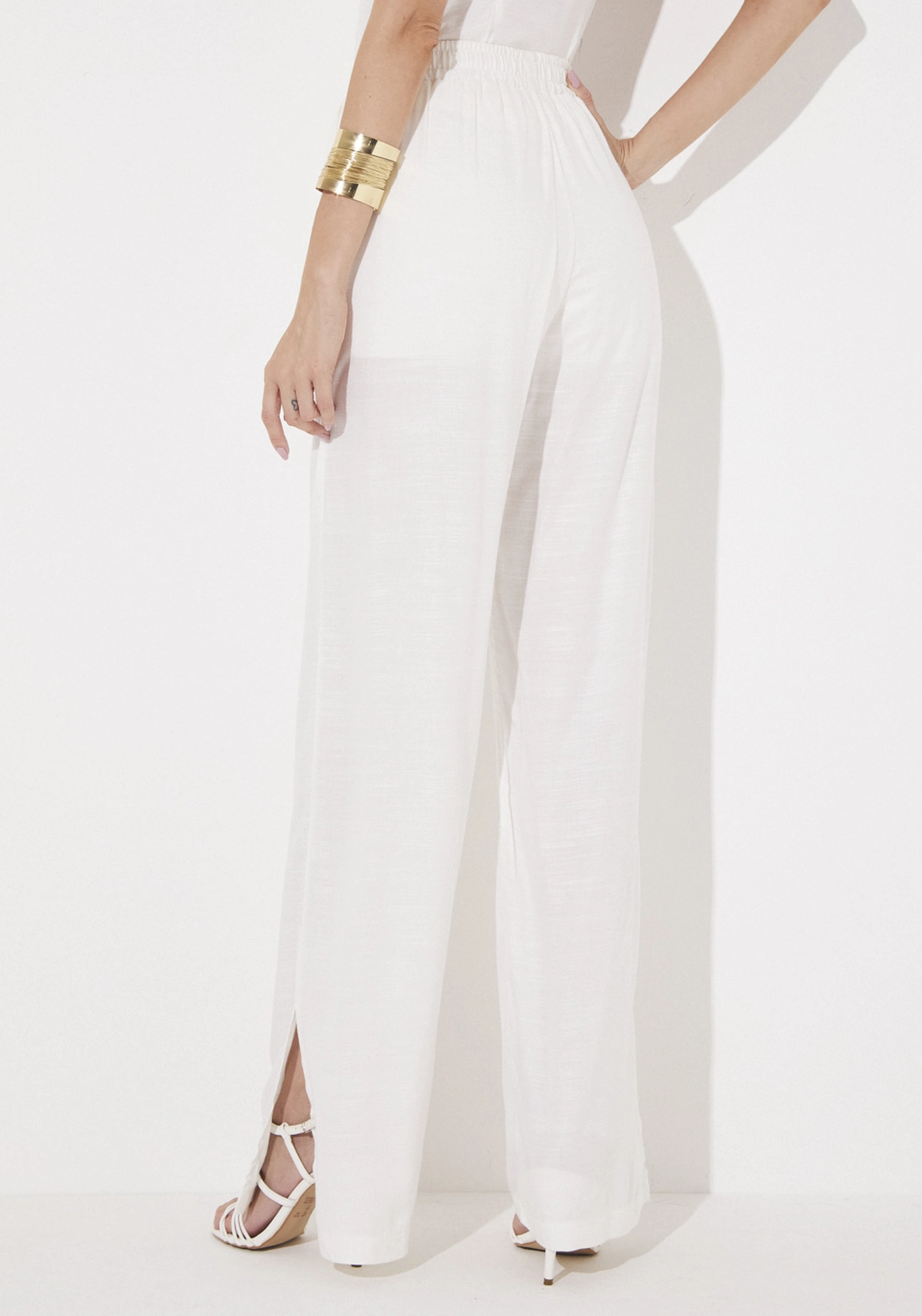 A calça apresenta modelagem reta, shape solto, cós alto com elástico interno, cordão para amarração na frente, possui forro, bolsos nas laterais, fendas nas laterais.