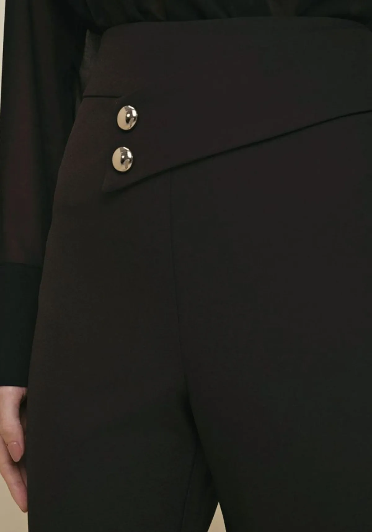 Calça de alfaiataria, modelagem slim. Cós alto com detalhe de faixa transpassada e botões fake na frente.