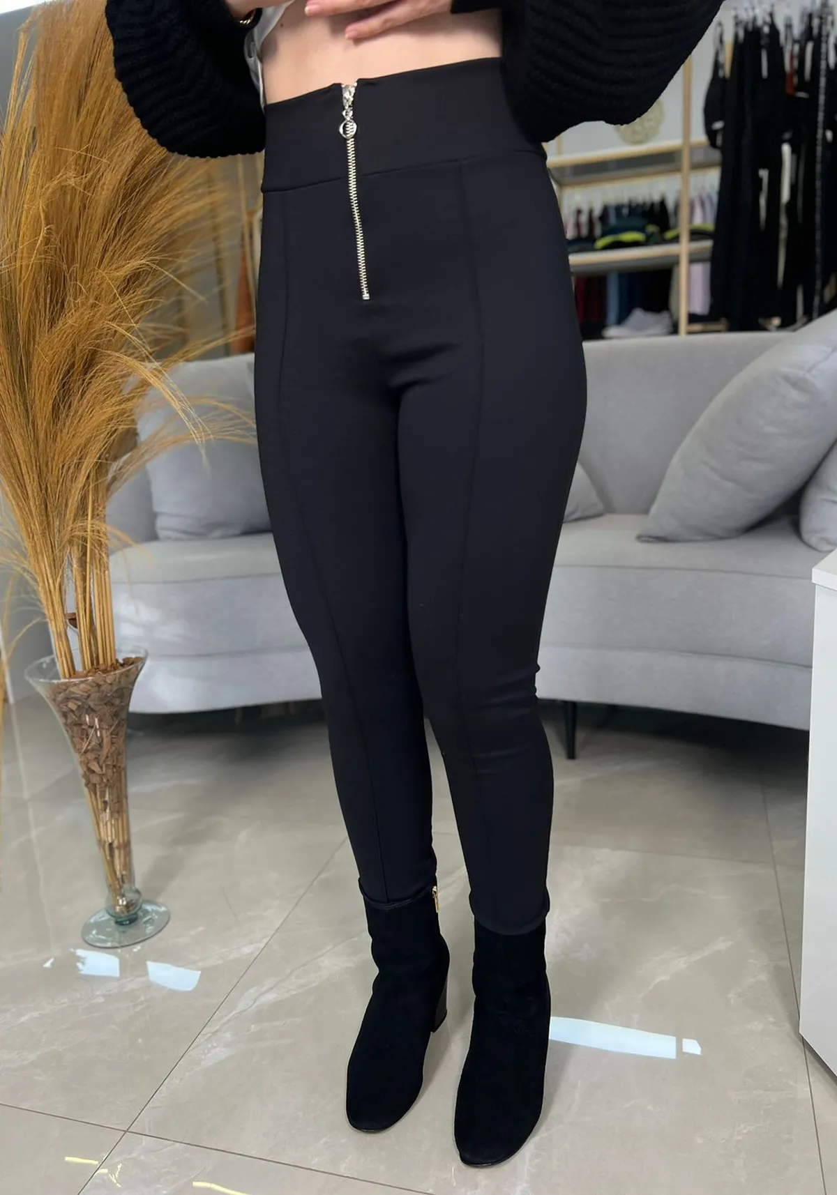A calça apresenta shape reto e modelagem Slim, fecho de zíper frontal.