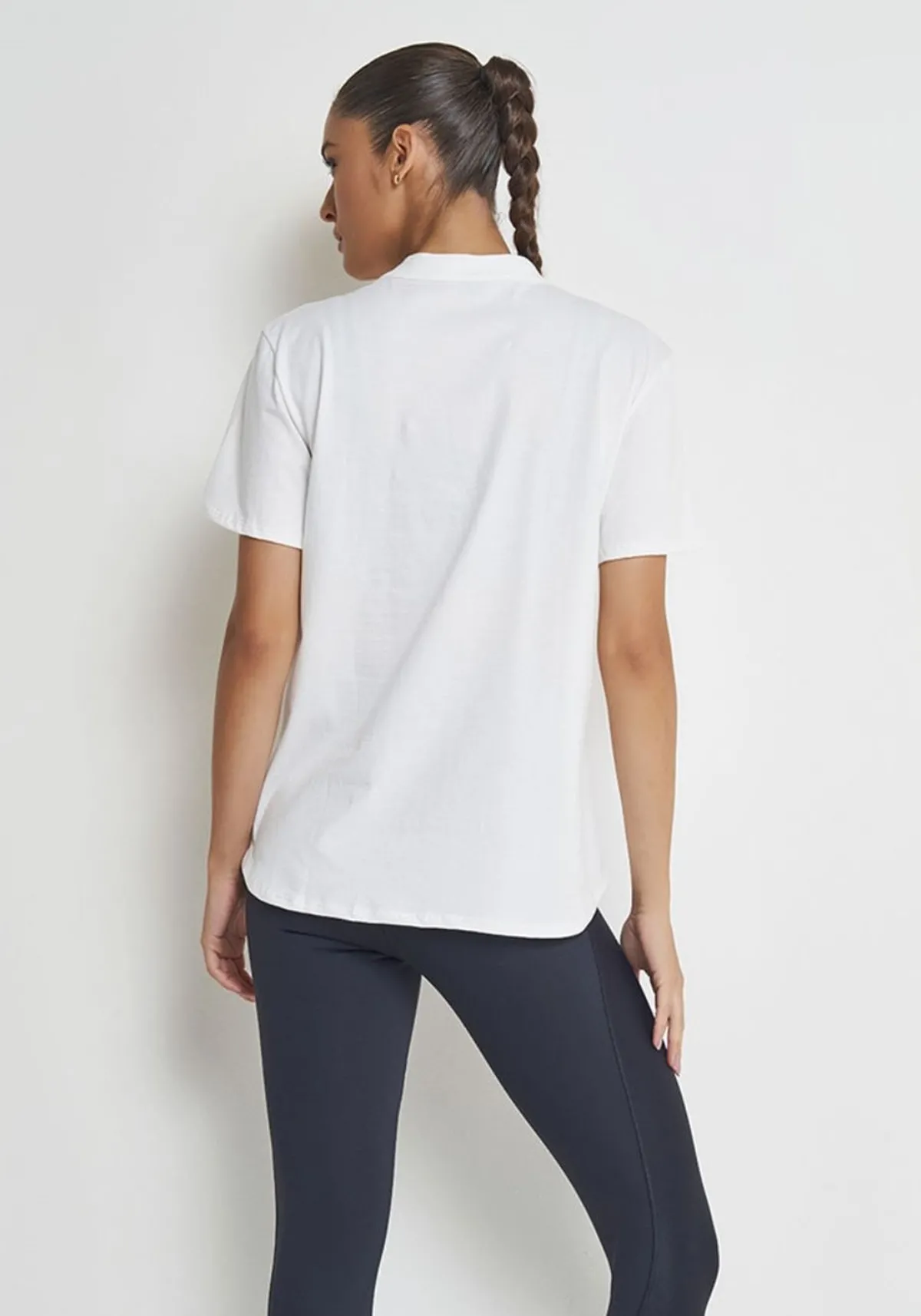 Possui mangas curtas, gola arredondada, modelagem comfy, com estampa na frente.