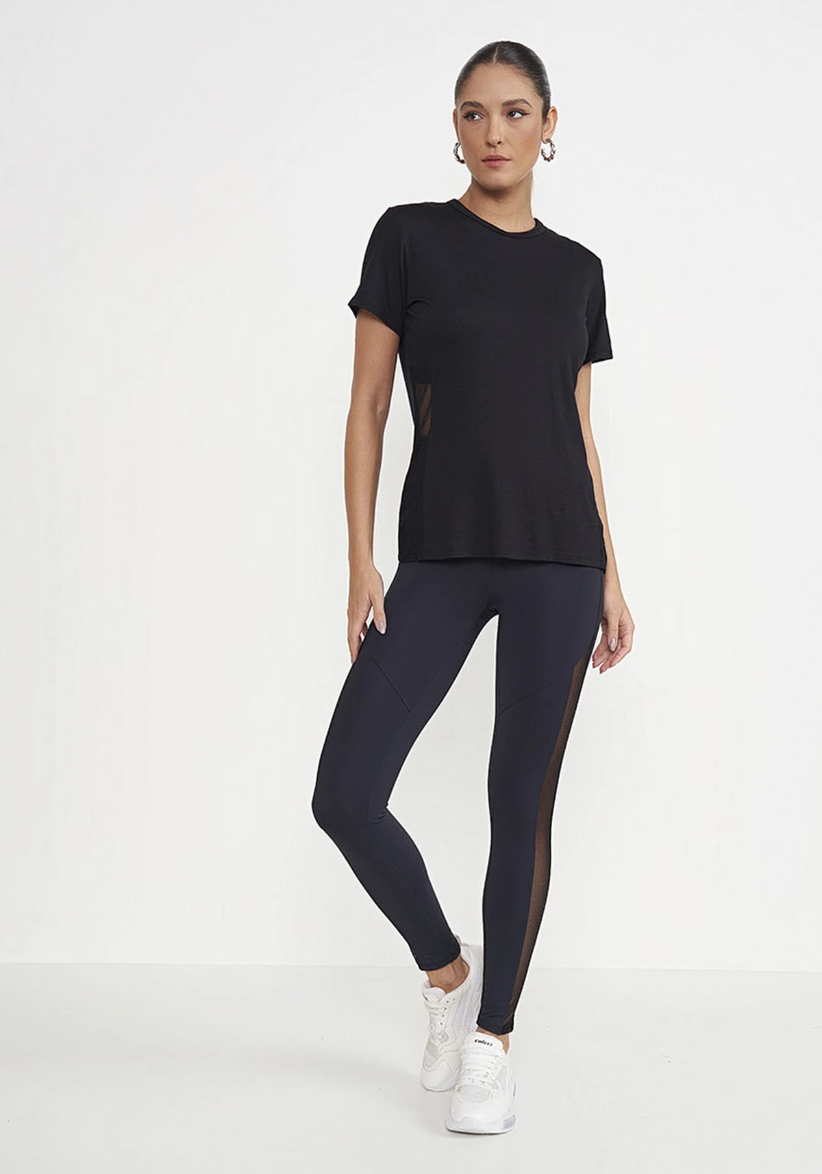 A camiseta apresenta modelagem justa, shape reto, comprimento longo, mangas curtas, gola arredondada, barra com acabamento simples, detalhe de recortes em tule nas laterais.