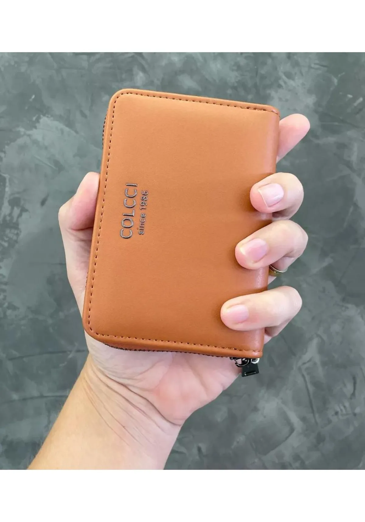 A carteira apresenta tamanho pequeno, fechamento por zíper metálico, possui cinco divisórias, sendo uma com fechamento por zíper, divisórias porta cartões, forro interno em material têxtil resistente e macio, toda em couro sintético, sem estampa, logo minimalista em metal na frente.