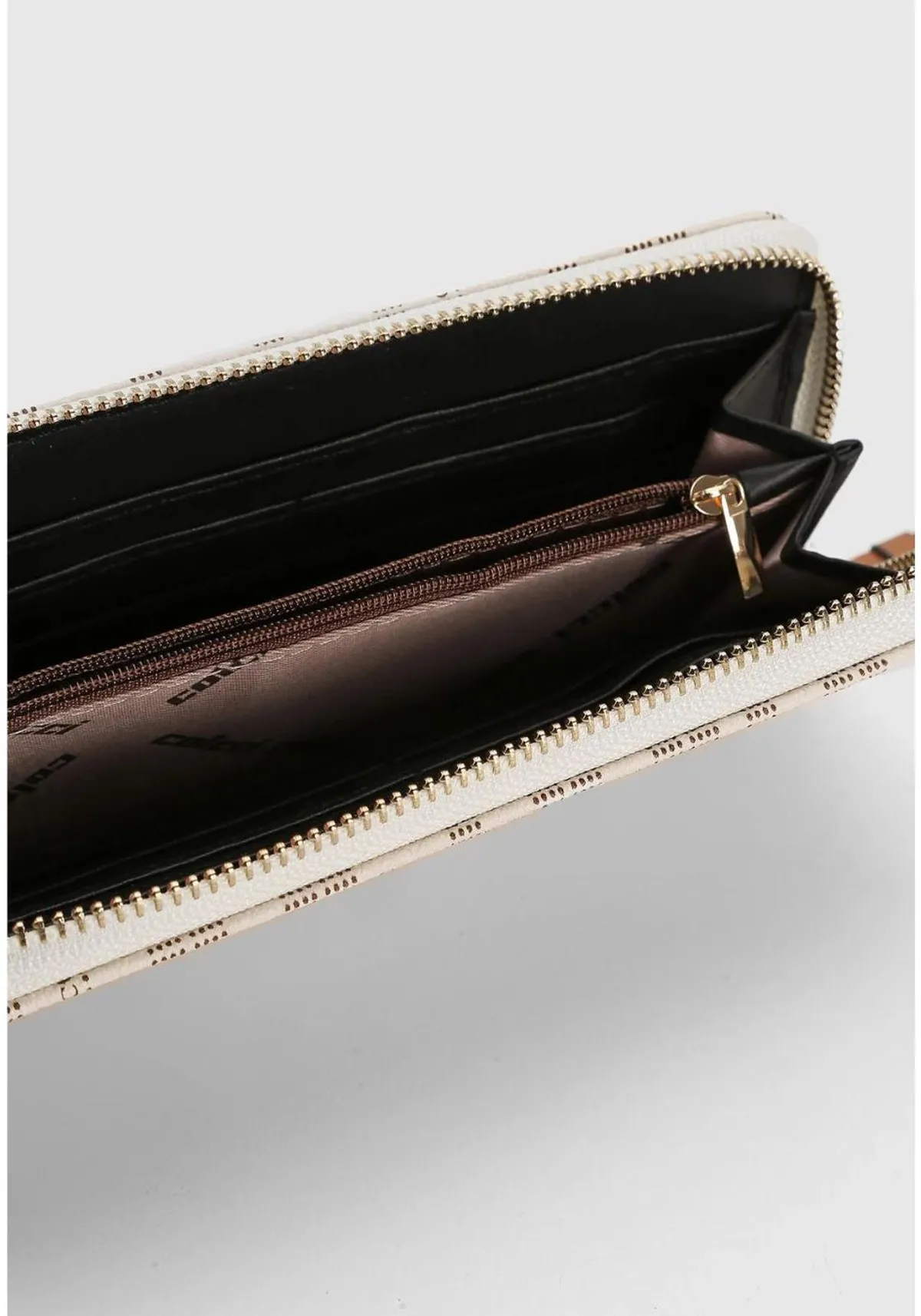 A carteira apresenta tamanho médio, fecho por zíper metálico, possui cinco divisórias, sendo uma com fecho por zíper, divisórias porta cartão, cursor do zíper em couro sintético na cor bege, toda em estampa de monograma da logo, logo em metal dourado na frente.