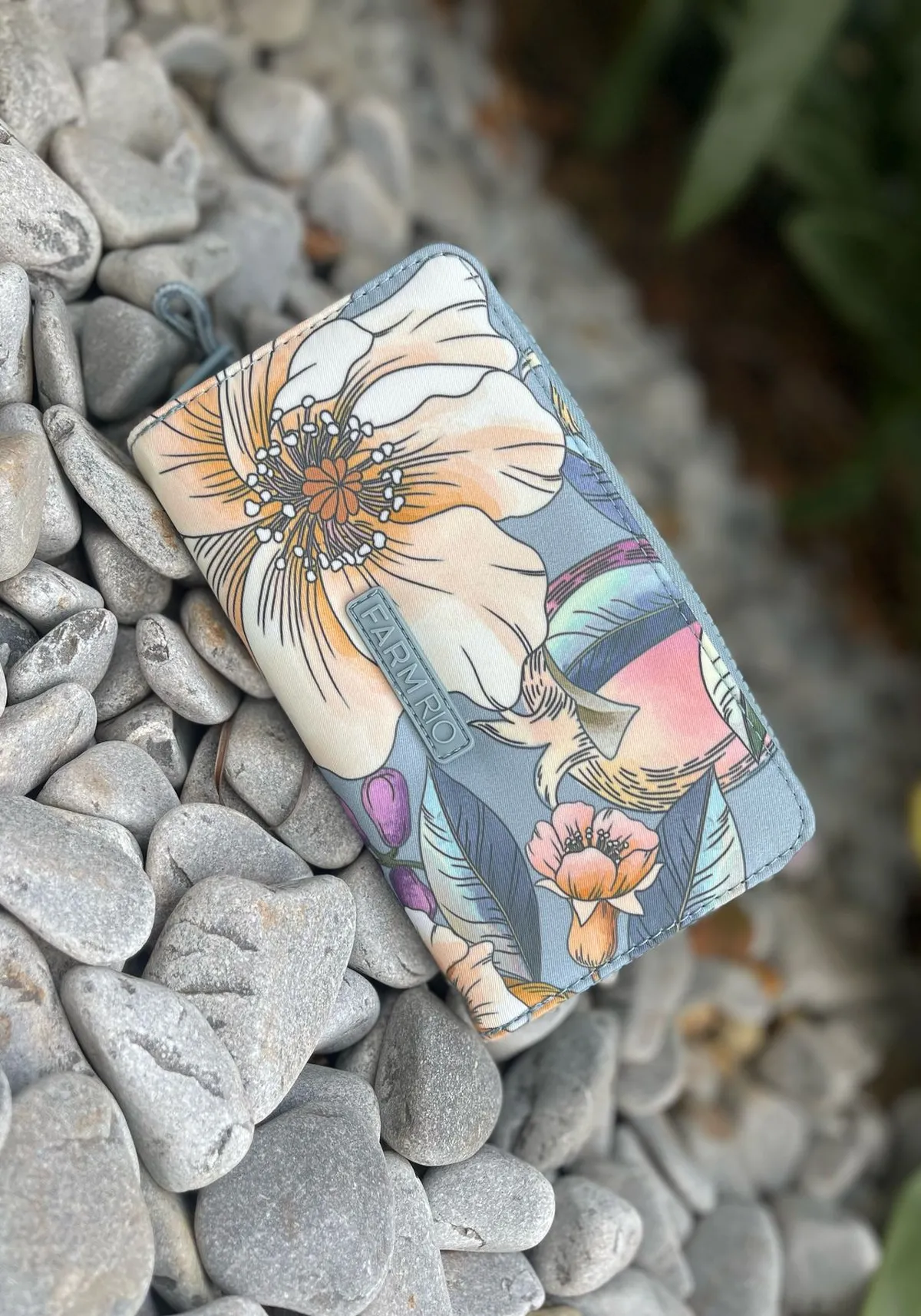 A Carteira Farm Astral Romance Em Flor é um acessório elegante e funcional da coleção Alto Inverno 2025 da FARM, destacando-se pela estampa floral em tons de azul.