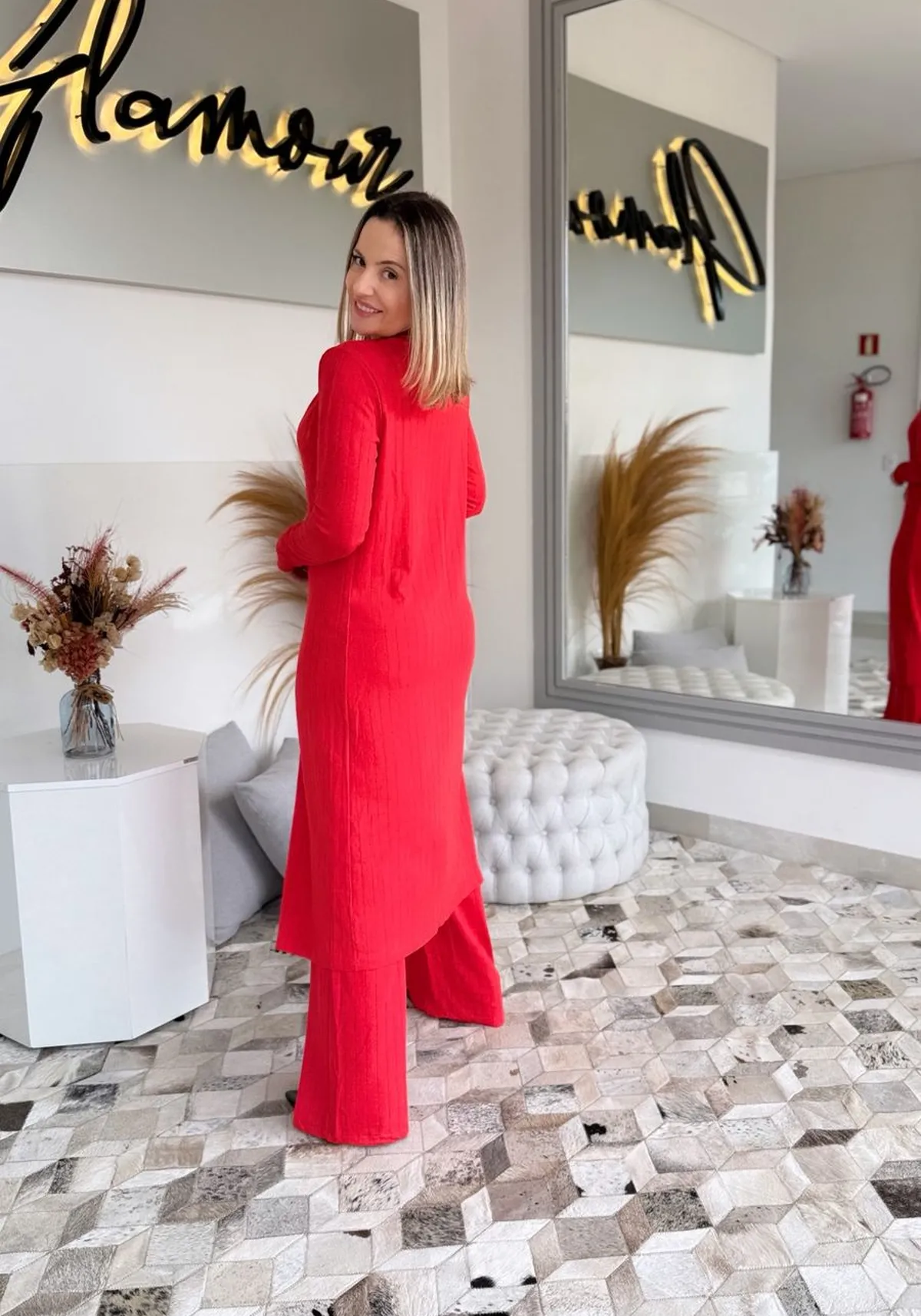 A cor vermelha traz intensidade e elegância, enquanto a modelagem versátil permite composições que vão do casual ao elegante, com praticidade e atitude.