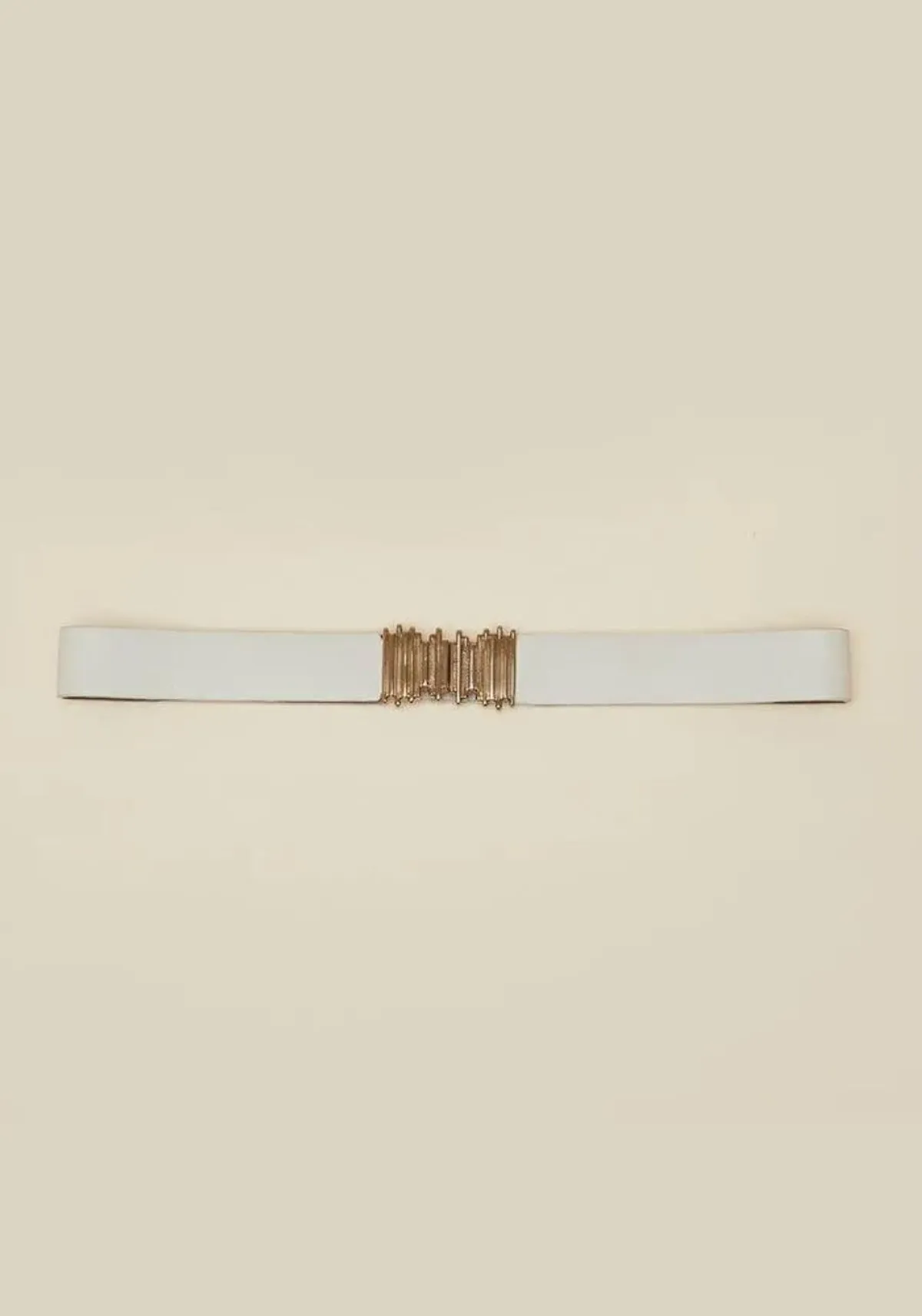 O cinto apresenta elástico no meio para melhor ajuste e conforto, fivela personalizada dourada metalizado, fechamento por encaixe.