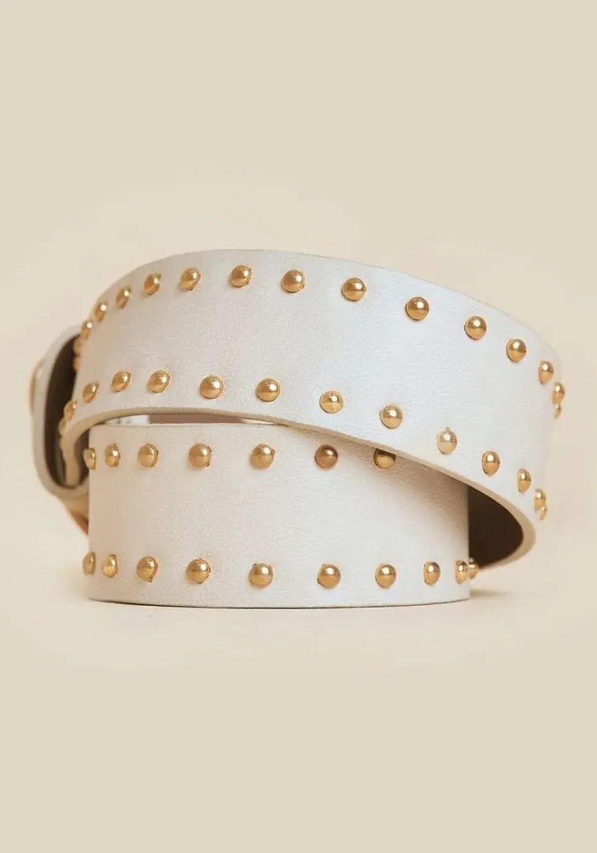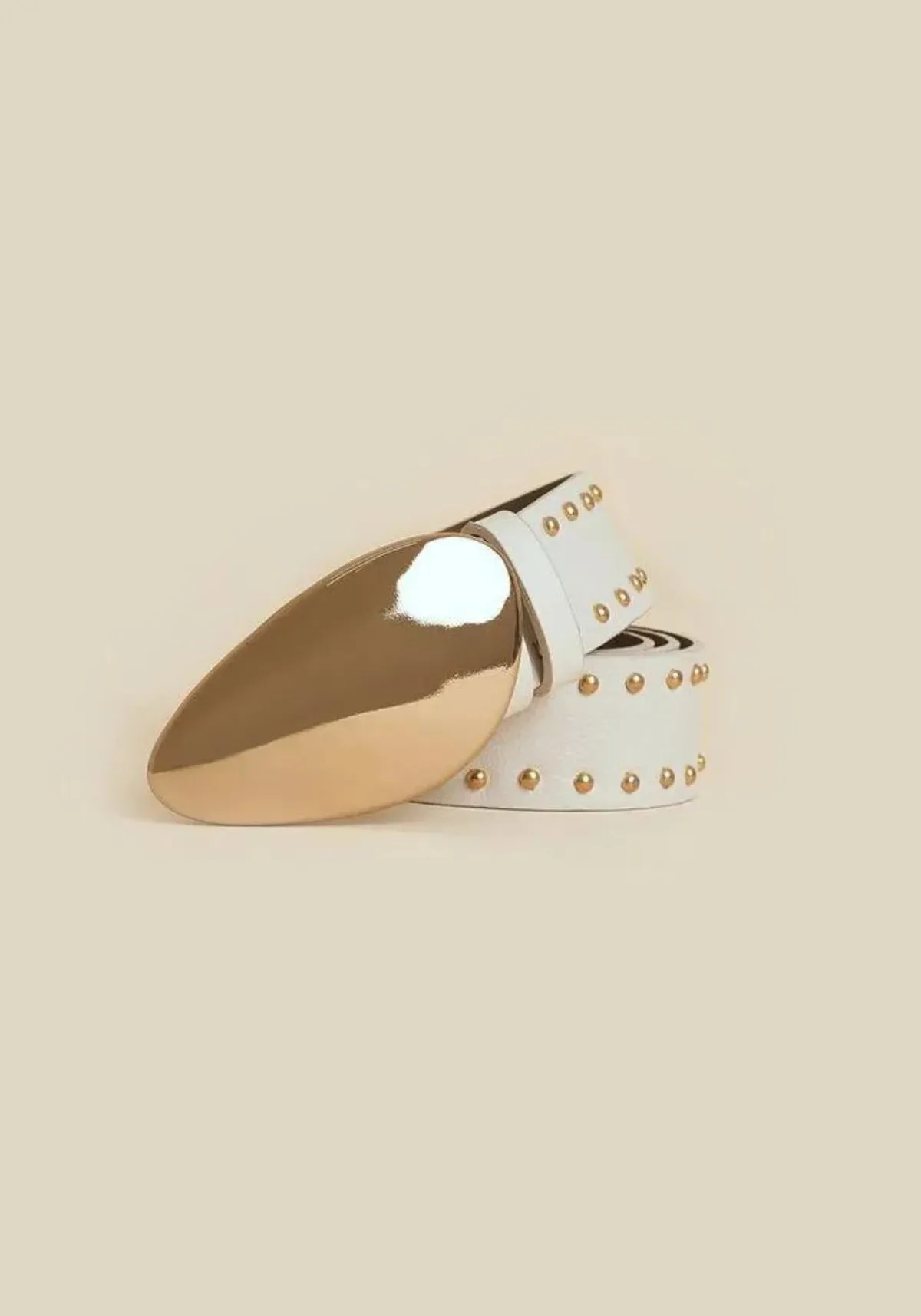 O cinto apresenta apliques de spike redondos dourados metalizados, 11 furos para regulagem, dois passadores para melhor regulagem e ajuste, fivela em formato assimétrico em dourado metalizada trazendo total destaque e diferencial para o cinto.