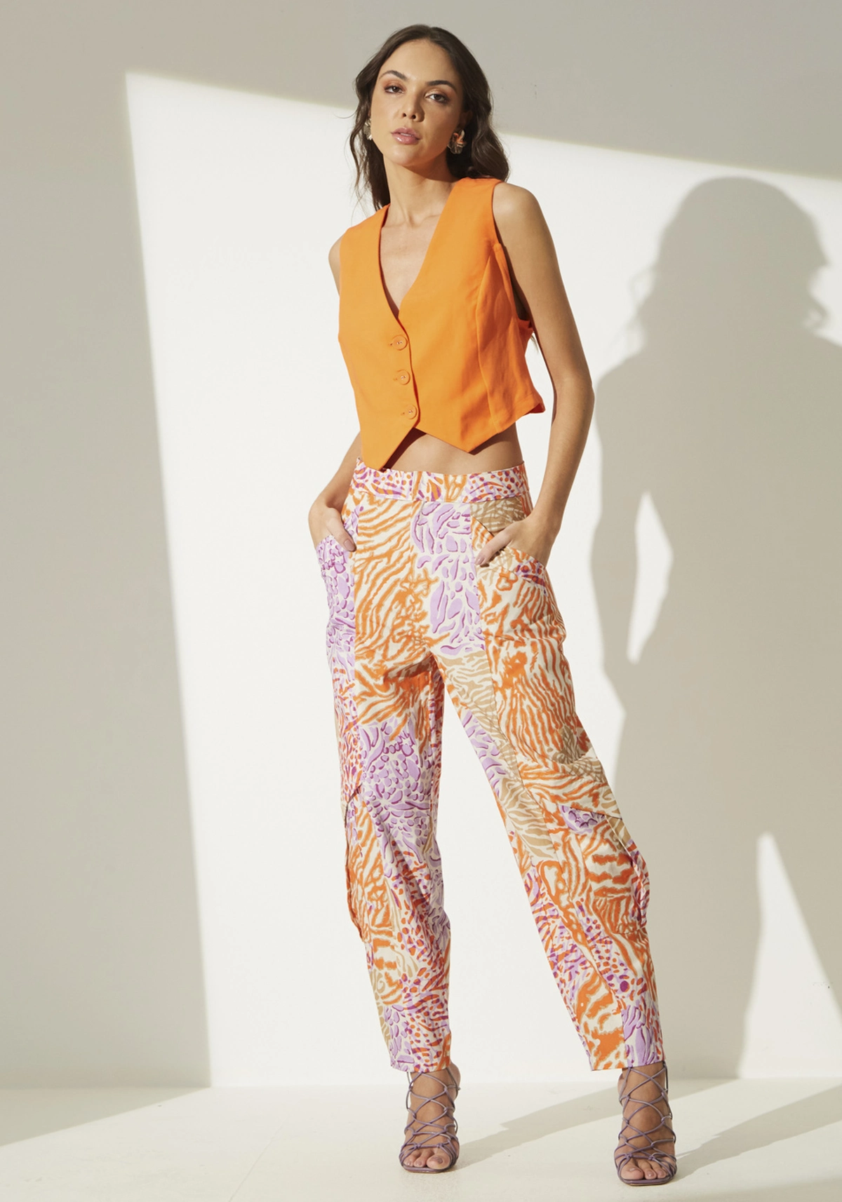 O colete apresenta comprimento cropped, modelagem slim, shape justo, decote V, fechamento por botões na frente, barra assimétrica, detalhe em fivela com regulagem nas costas, possui forro no busto.