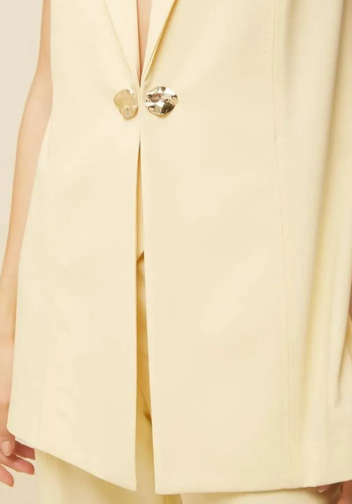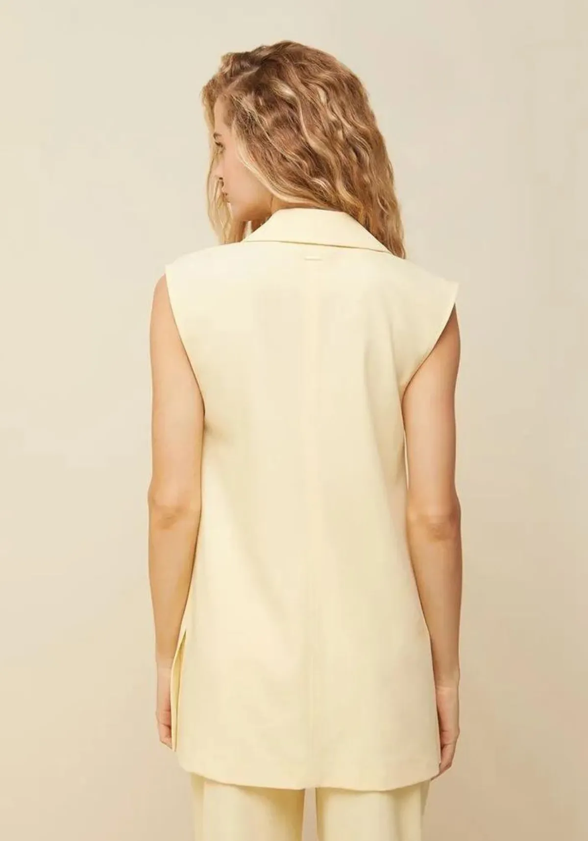O colete alongado é uma sobreposição sem mangas que se diferencia pelo seu comprimento, ultrapassando a linha da cintura.