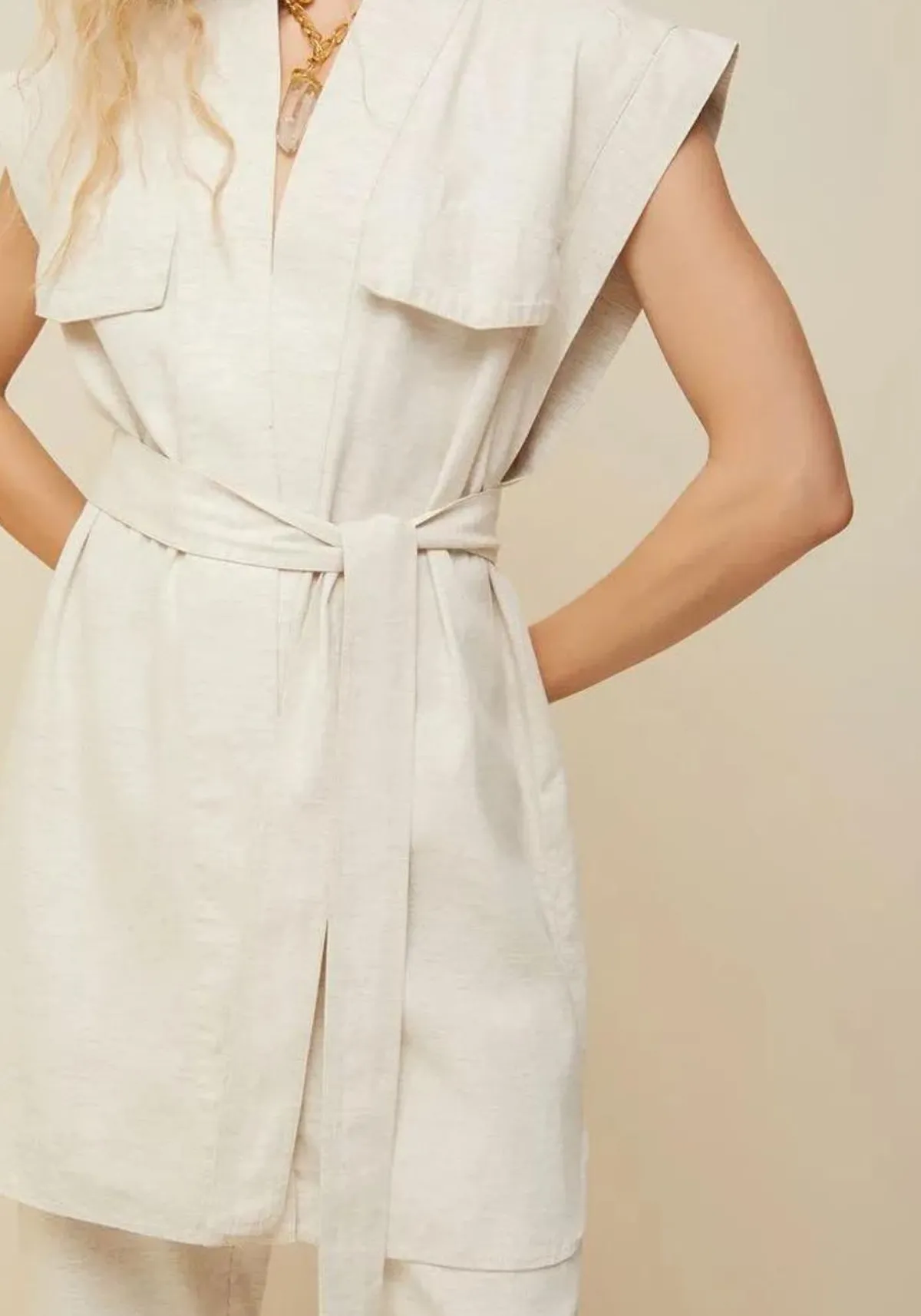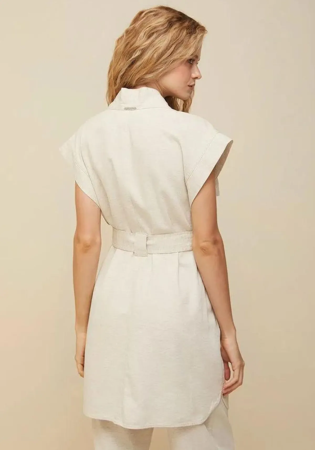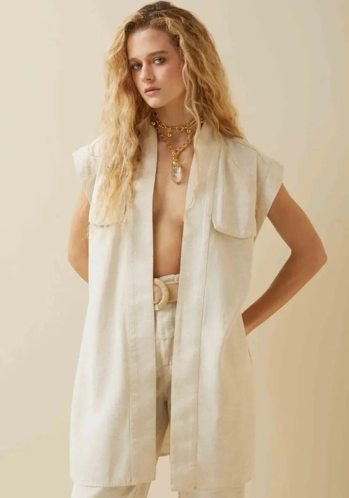 O colete alongado é uma sobreposição sem mangas que se diferencia pelo seu comprimento, ultrapassando a linha da cintura.