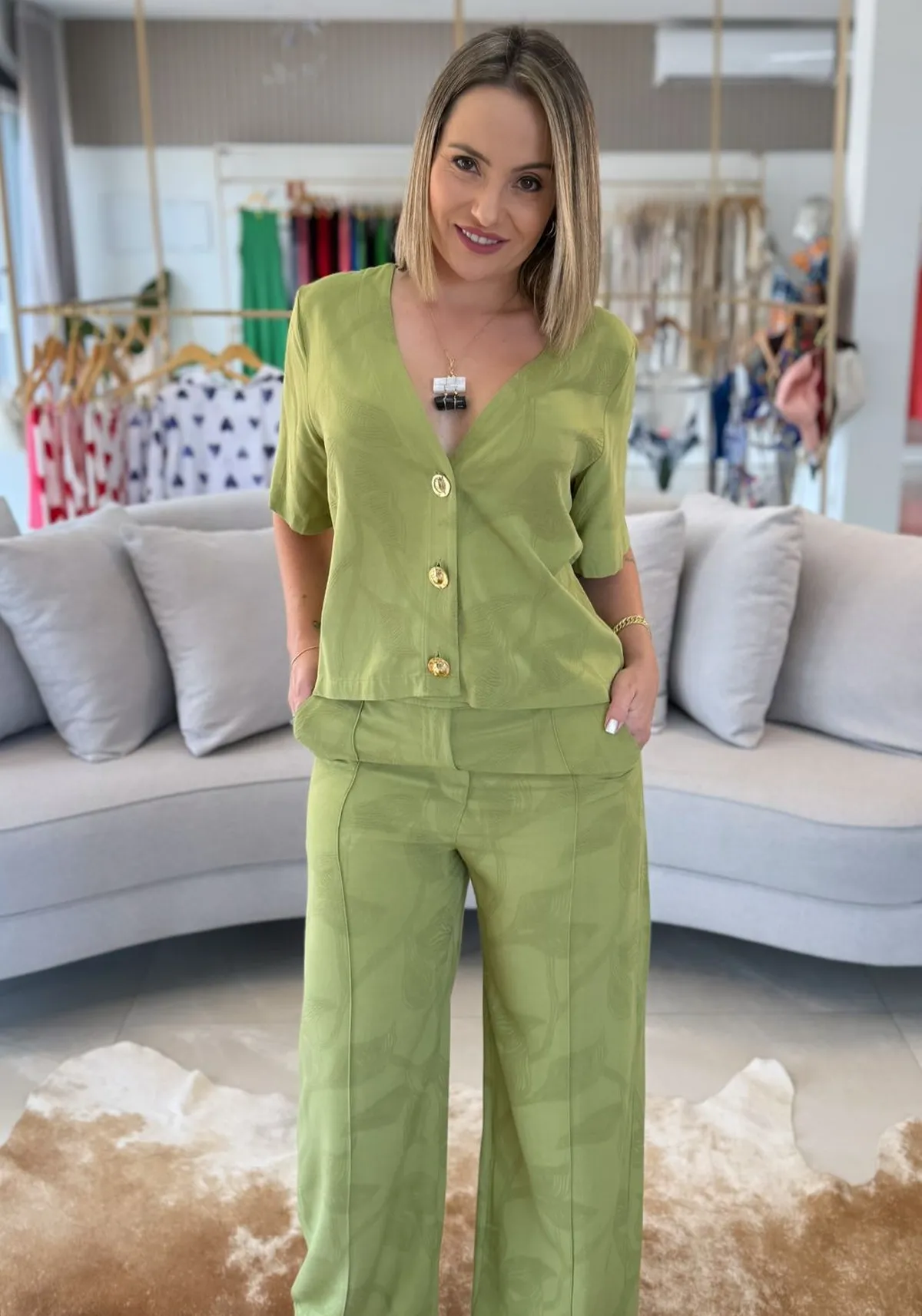 A calça com cintura alta e corte reto alonga a silhueta, proporcionando um visual esguio e elegante. O tecido leve e fluido garante um caimento impecável.