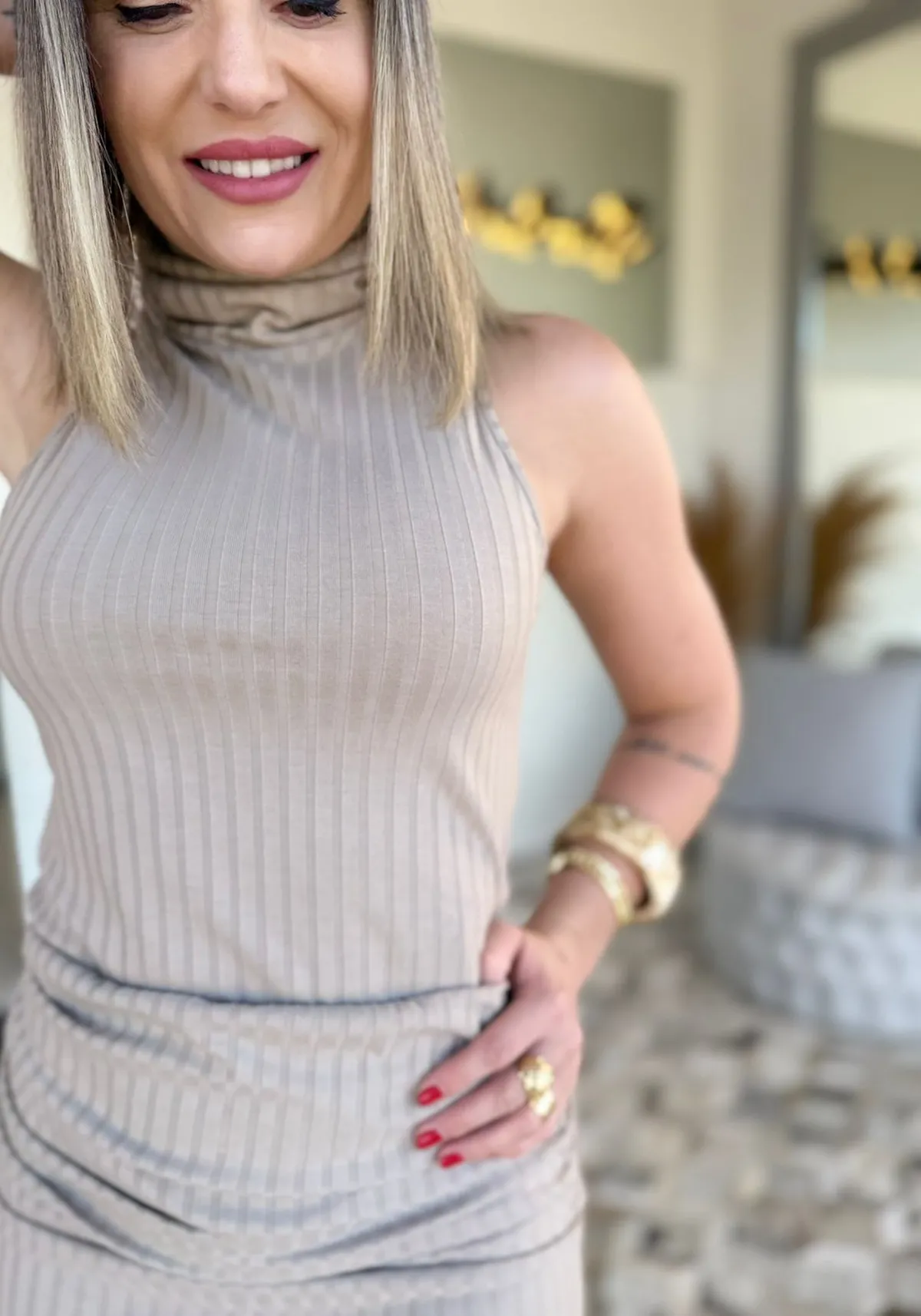 O tom bege champanhe adiciona um toque refinado e atemporal à peça, perfeito para composições neutras e modernas. Um look versátil que transita com facilidade do casual chic ao social leve.