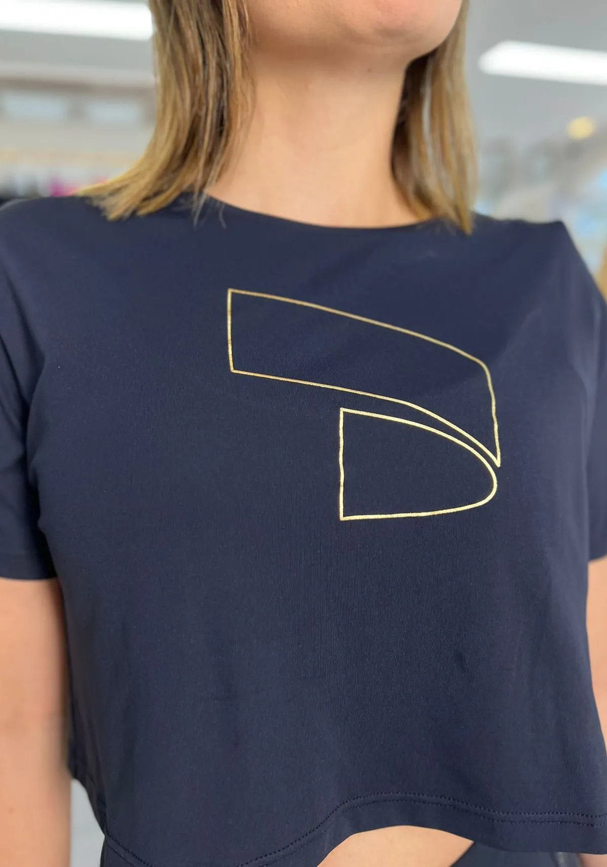 T-shirt com comprimento cropped, decote redondo fechado para dar mais segurança de movimentos, mangas curtas, detalhe de símbolo da logo em dourado na frente, modelagem solta, não possui bojo.