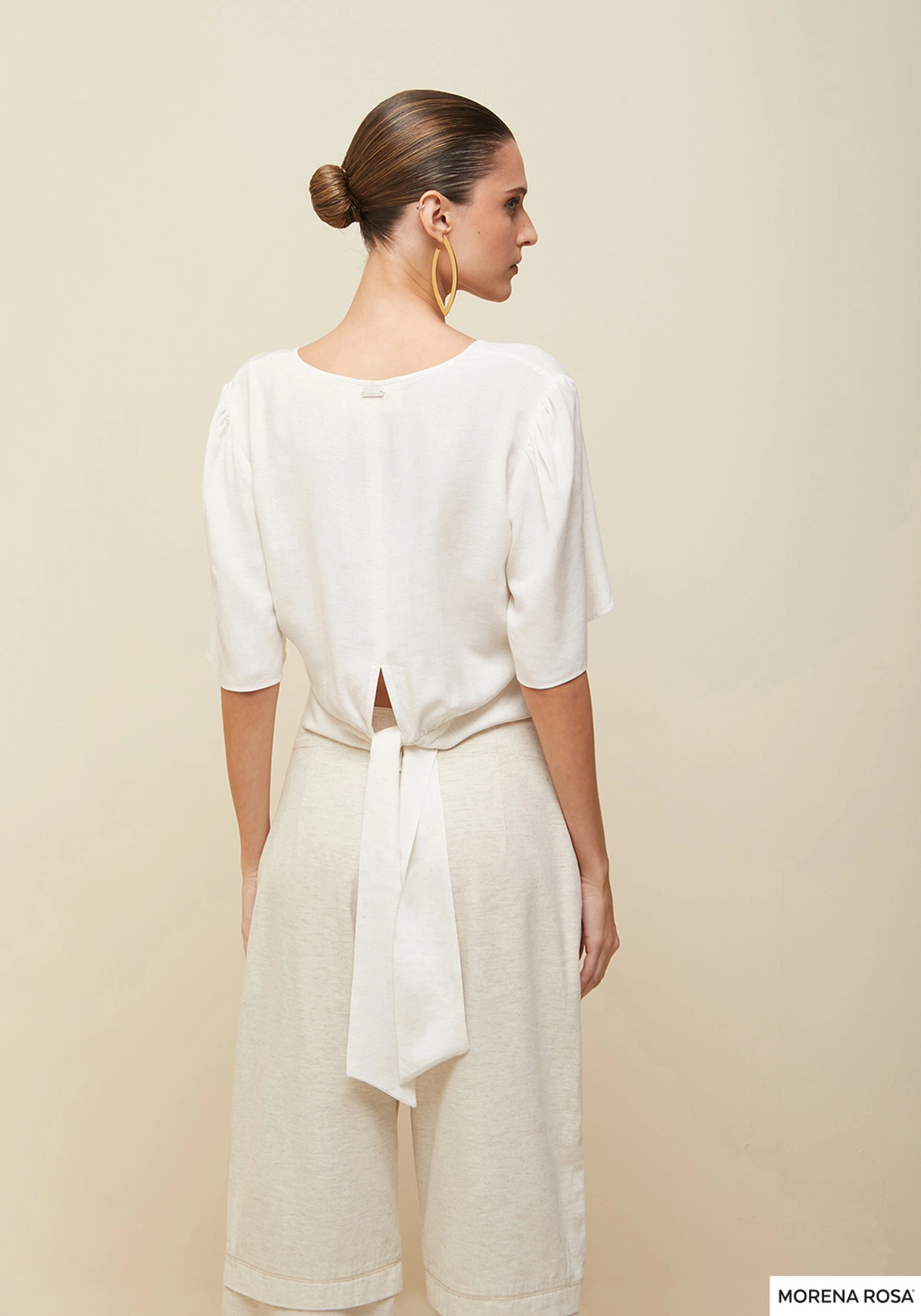 A blusa apresenta modelagem ampla e solta, comprimento cropped, mangas curtas soltas, decote V alongado, barra com faixas para amarração personalizada atrás, não possui bojo.