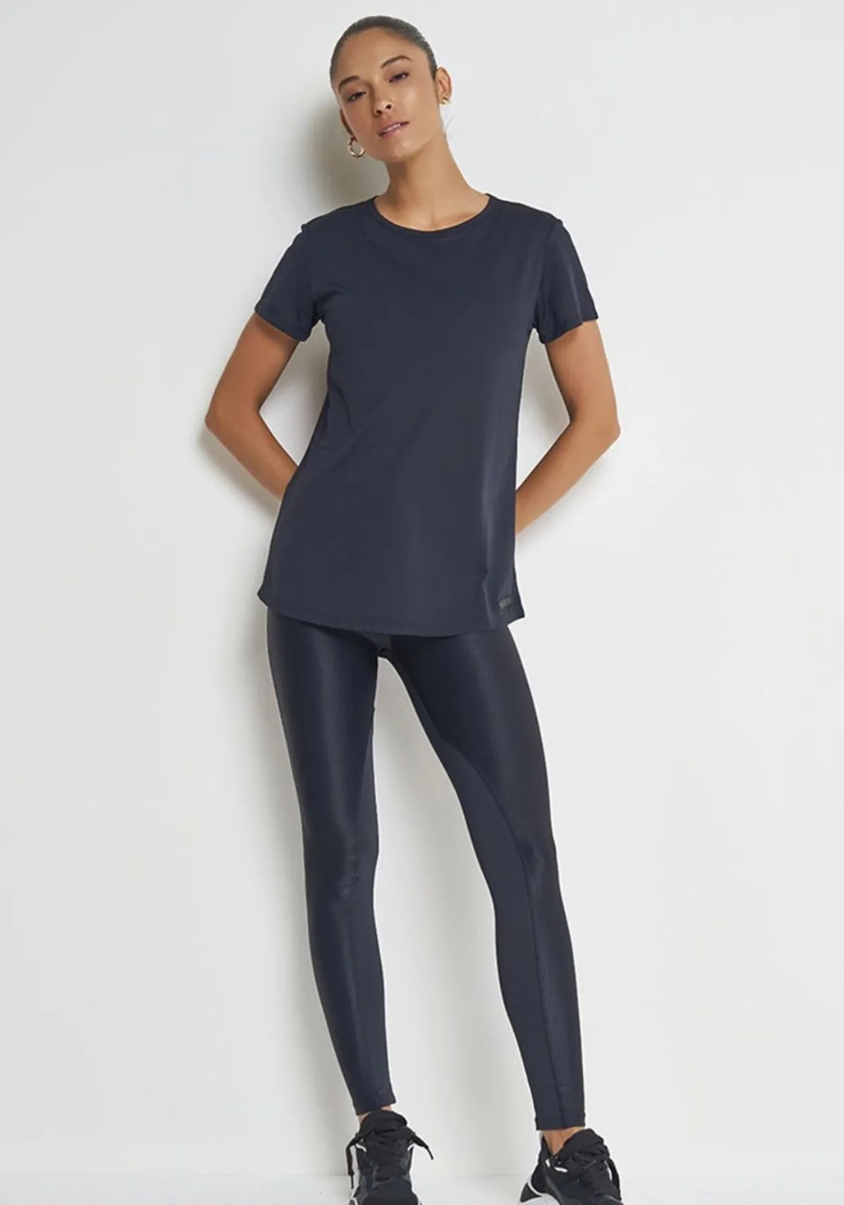 Camiseta apresenta shape justo e modelagem slim comfort. Possui gola arredondada, mangas curtas e barra com acabamento simples.