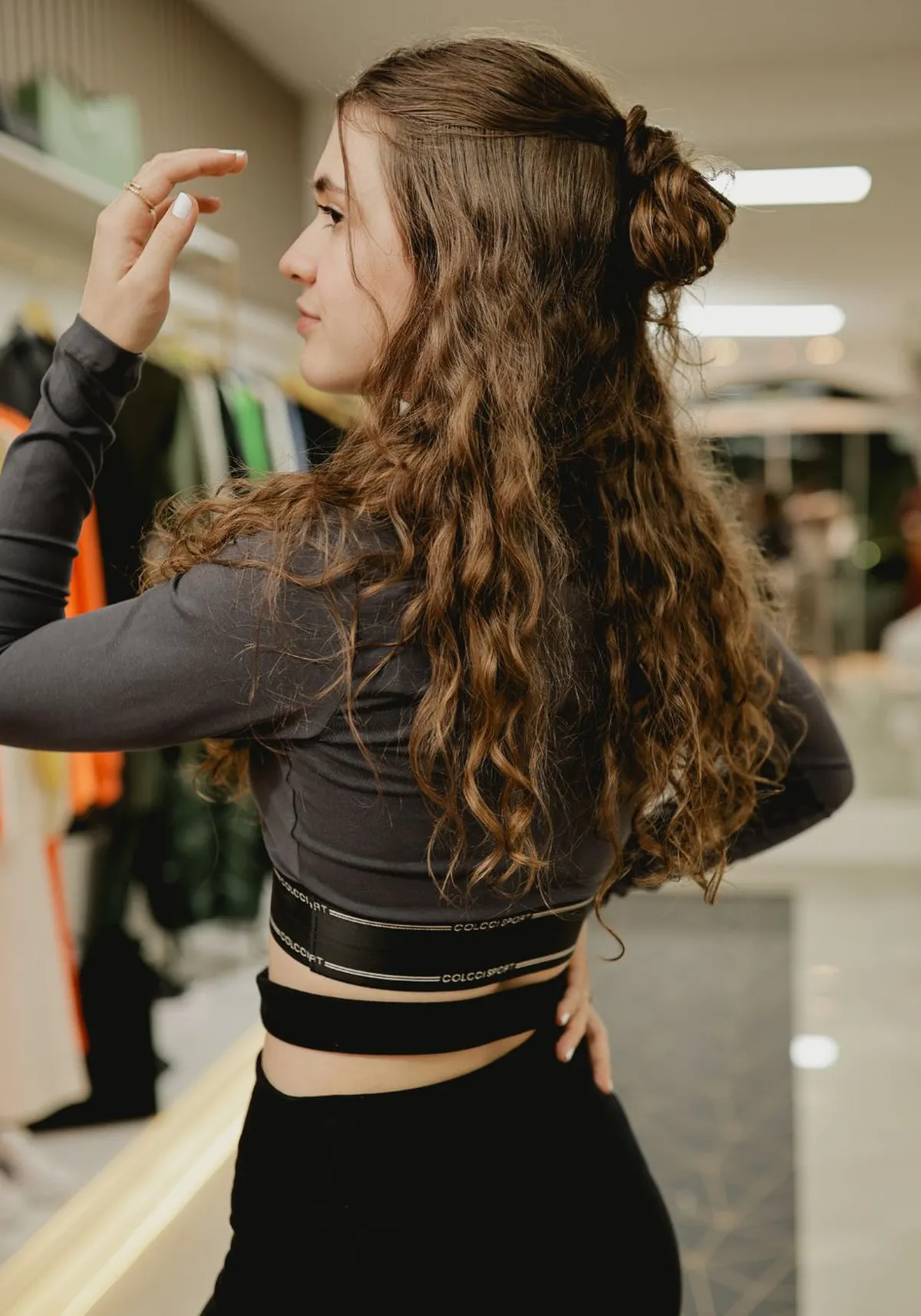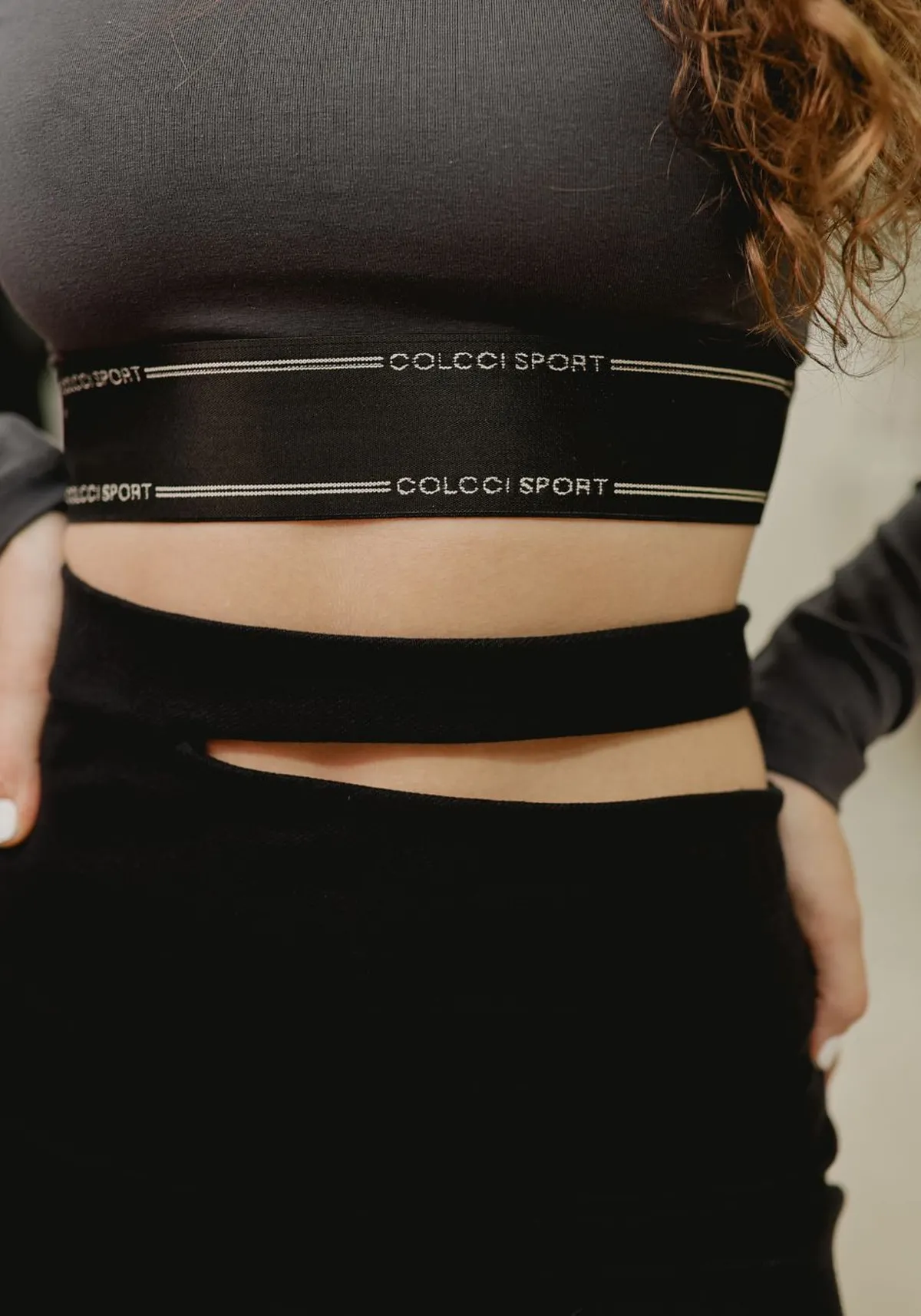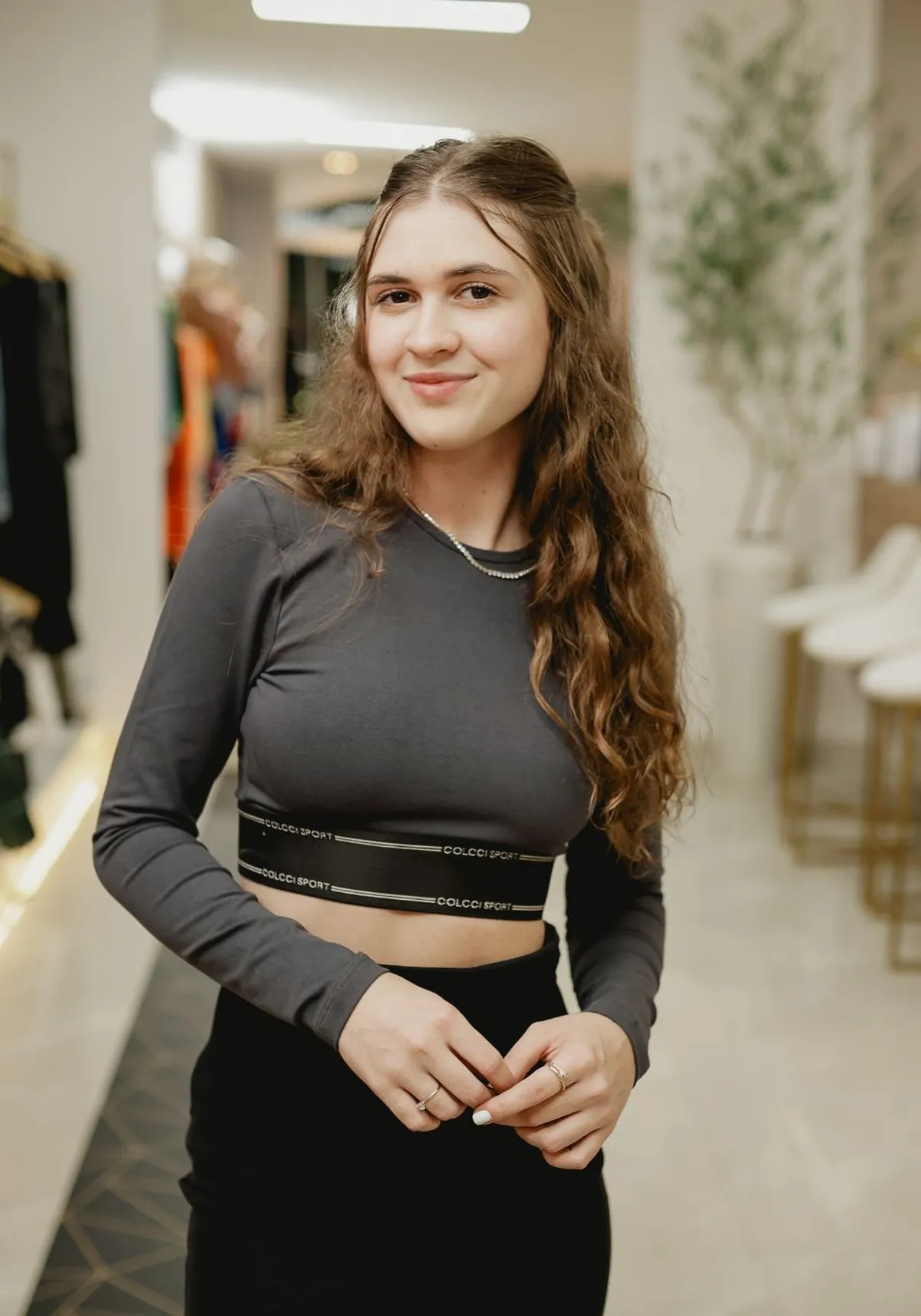 Blusa de mangas longas, comprimento cropped, elástico personalizado no cós, gola arredondada, modelagem slim.