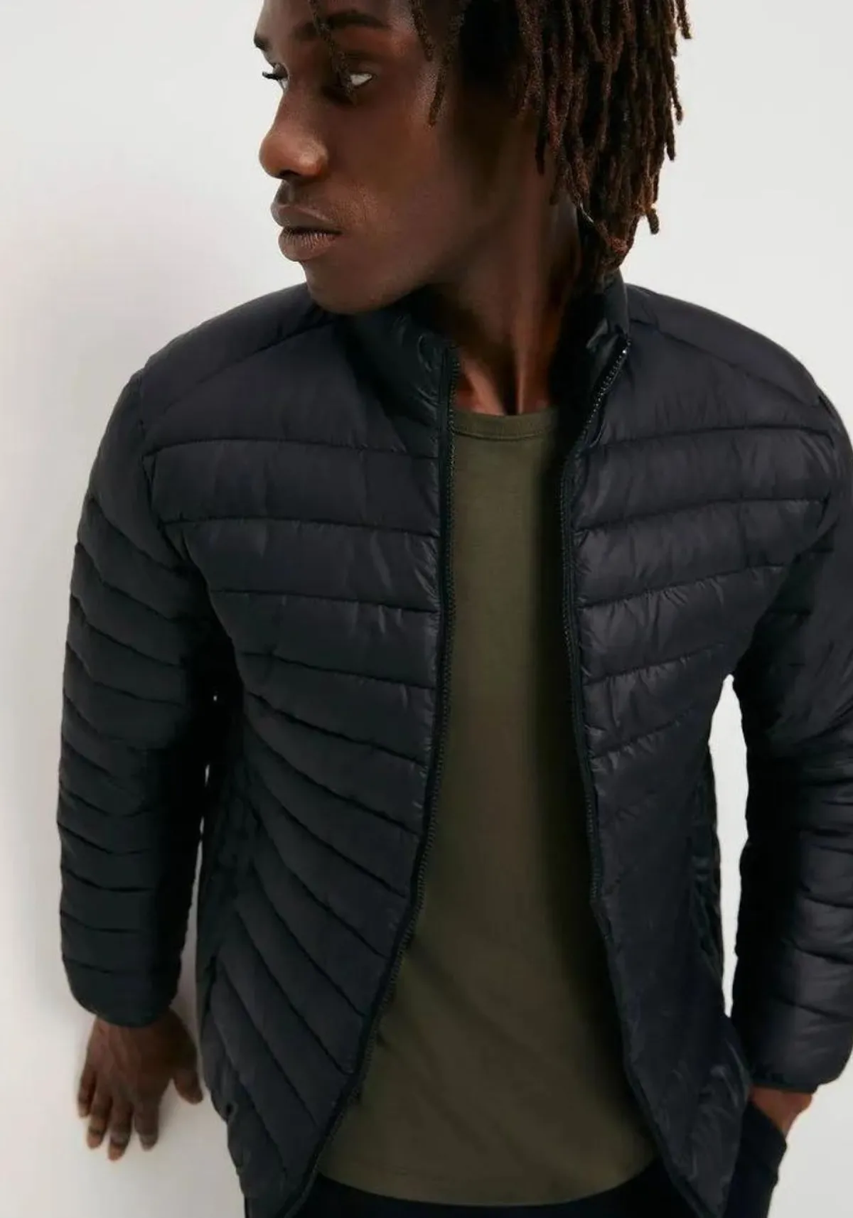 Jaqueta básica masculina puffer, ideal para sobreposições com conforto e estilo. Não possui capuz.